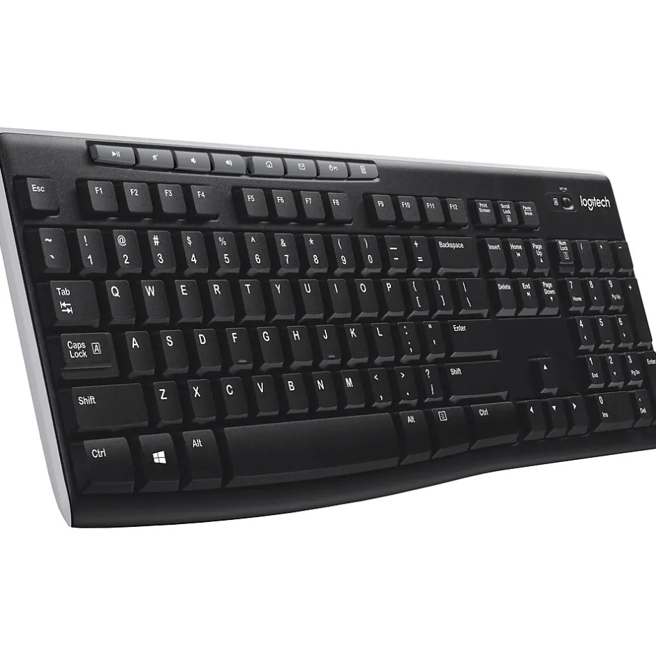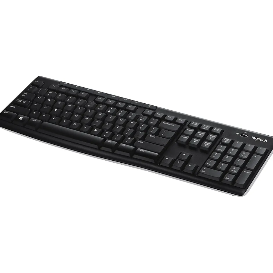 Logitech K270 USB wireless black keyboards optimize your computing set-up with wireless connectivity that works up to 30 feet away with no delays or dropouts. This full-size keyboard contains everything you need to enhance your productivity, including a full-sized keypad, but there are also eight shortcut keys that manage multimedia options for when you have videoconferencing or video training. A long battery life ensures your keyboard doesn’t cut out at inopportune moments when you have a busy day typing reports or presentations.