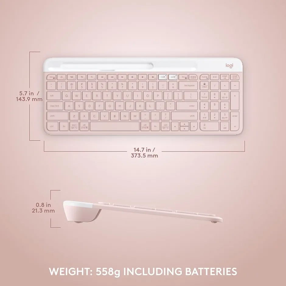 Own your space with the K585 Slim Multi-Device – an ultra-thin and design-forward keyboard perfect for simultaneously typing your ideas on your laptop and a text on your smartphone. Type across computers, tablets, and smartphones from one keyboard for one seamless workflow — with a built-in phone cradle for easier multitasking. The compact design integrates a number pad and media shortcuts, so you can work efficiently and comfortably in tight spaces. The quiet low-profile keys offer fluid, laptop-like typing, while an auto-sleep feature reserves battery life, so you can power through your work.