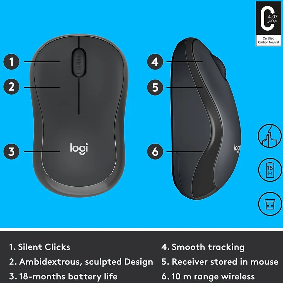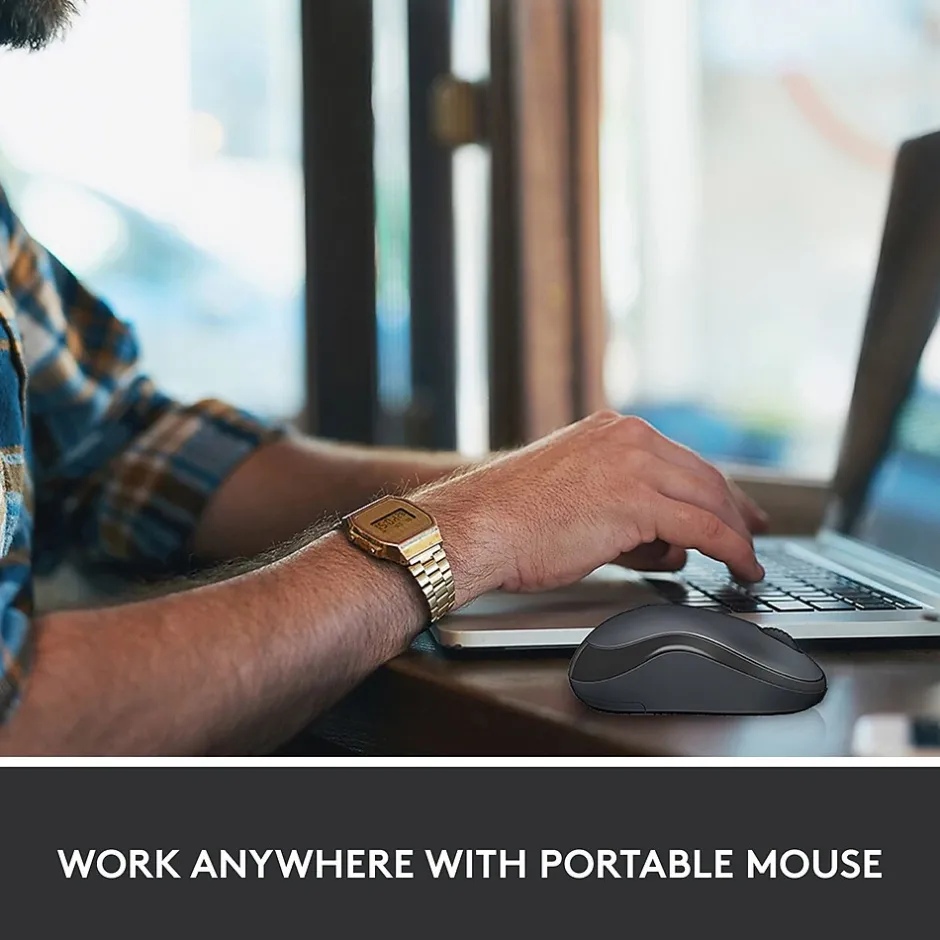 With the same click feel and 90% noise reduction compared to classic mice, M220 Silent offers a quiet user experience. The mouse has a long-lasting 18-month battery life with auto-sleep and a powerful 33′ wireless range. Simply plug the tiny USB receiver, and use with Windows, macOS, Chrome OS, or Linux. M220 features Logitech advanced optical tracking designed for smooth and precise moves on almost any surface. Stay productive longer with the comfortable shape that is equally suitable for both left- and right-handed users. The compact, portable cordless mouse fits easily with your laptop in a bag, so you can take it anywhere you work.