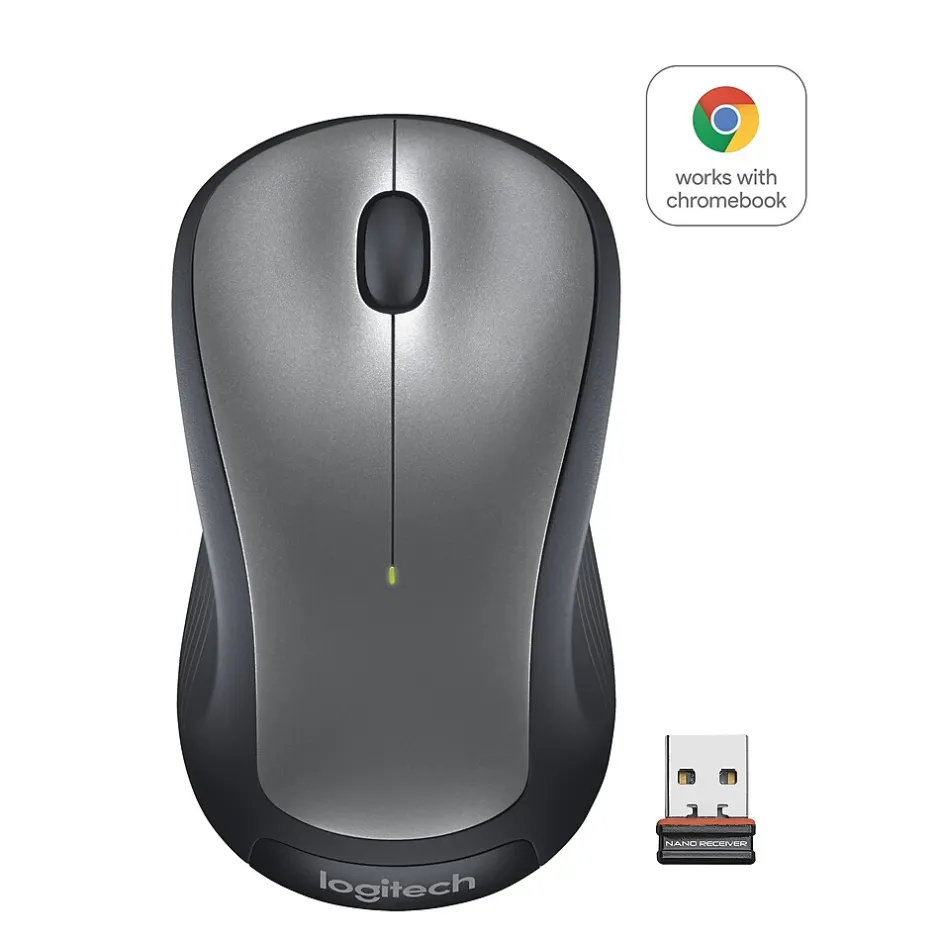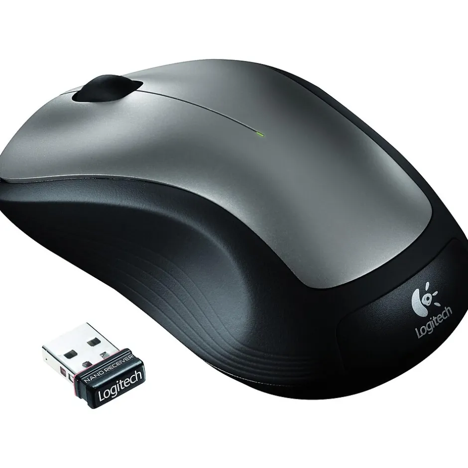 Scroll, point and click your way through each workday with this Logitech optical wireless ambidextrous mouse. Soft rubber side grips and a gently curved design provide a comfortable fit in either hand, while the center scroll wheel and three thoughtfully placed buttons allow effortless operation. With an 18-month battery life, this Logitech optical wireless ambidextrous mouse delivers dependable, uninterrupted use.