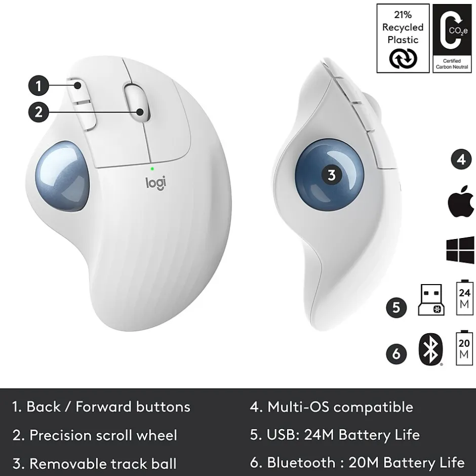 Meet ERGO M575, a wireless trackball with incredibly easy thumb control. This is another addition to the Logitech ERGO series that promotes increased comfort, lower muscle strain, and improved, more natural posture. Forget about sliding around a mouse or moving your arm to move the cursor. The ergonomic sculpted shape of ERGO M575 minimizes movement and maximizes comfort while keeping your hand and arm relaxed. With two ways to connect, via Bluetooth Low Energy or the USB receiver, the trackball provides you with a powerful, stable signal with a 33′ (10m) range. No need to move your trackball, so it’s perfect for tight workspaces and busy desks. A single AA battery lasts up to 24 months with the Unifying USB receiver and up to 20 months with Bluetooth Low Energy.