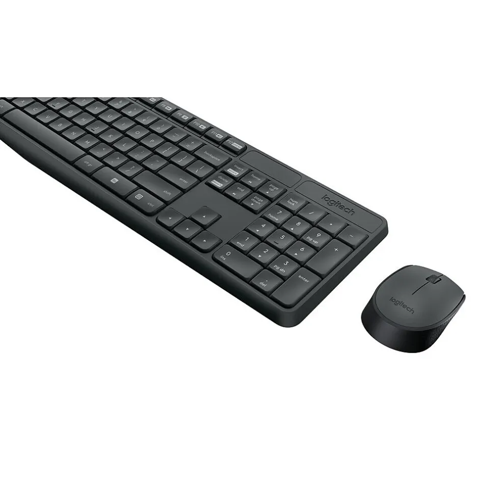 Control your computer with this practical Logitech MK235 keyboard and mouse set. The USB wireless design is easy to install so you can get to work faster, and the optical tracking on the mouse provides accurate, smooth movement. This keyboard set is made from heavy, durable materials to help it withstand busy offices and daily use, and the full-size and standard layout makes it easy to type and enter data. The mouse and keyboard come in standard black color for a professional look.
