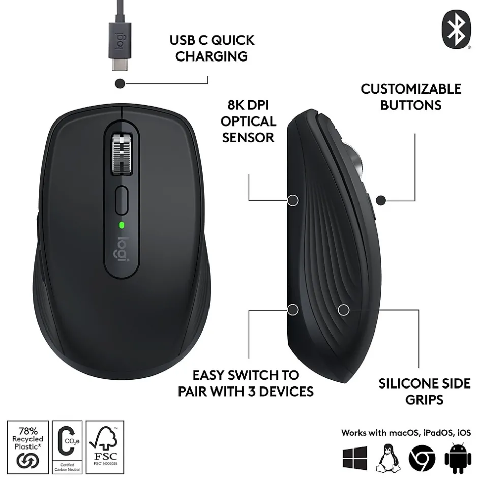 Introducing the Logitech MX Anywhere 3S, a beloved compact wireless mouse with next-level precision and control. Now with Quiet Click buttons that deliver a satisfying tactile feel with less click noise (compared to MX Anywhere 3). The MX Anywhere 3S also comes with an 8000 dpi optical sensor for next-gen responsiveness on any surface, including glass (0.16″ minimum glass thickness). MagSpeed electromagnetic scrolling delivers remarkable speed, precision, and near silence, with the ability to scroll 1000 lines per second. The low-profile design is contoured for your hand. The Logi Options+ app enables Flow cross-computer control and introduces more customizations than ever. The MX Anywhere 3S stays powered up to 70 days on a full charge and delivers three hours of use from a one-minute quick charge.