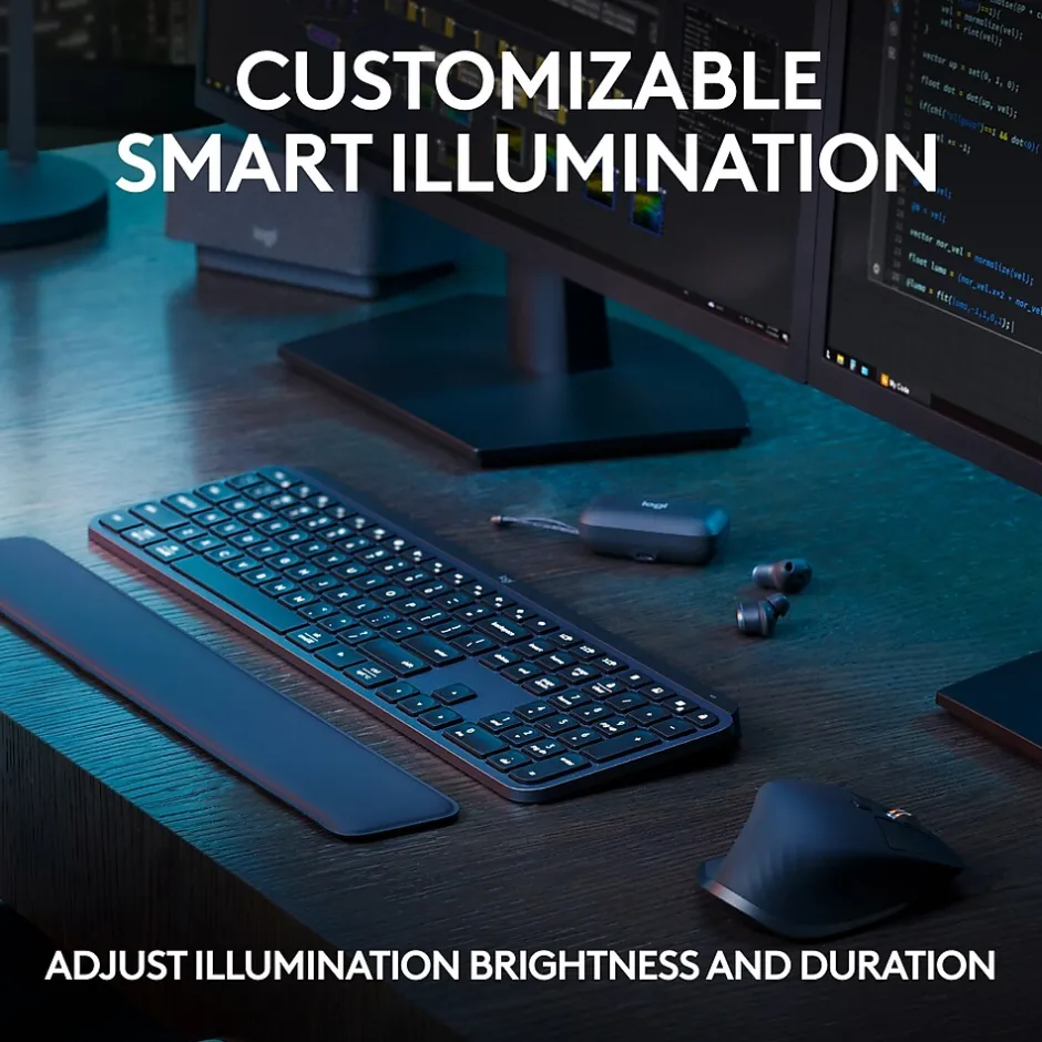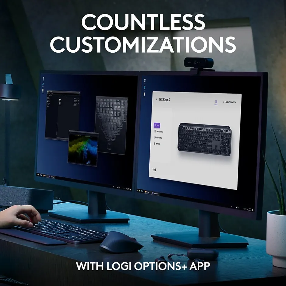 - Backlit keyboard keys light up and adapt to the environment as your hands approach it; now with more lighting customizations available via Logi Options+ app
