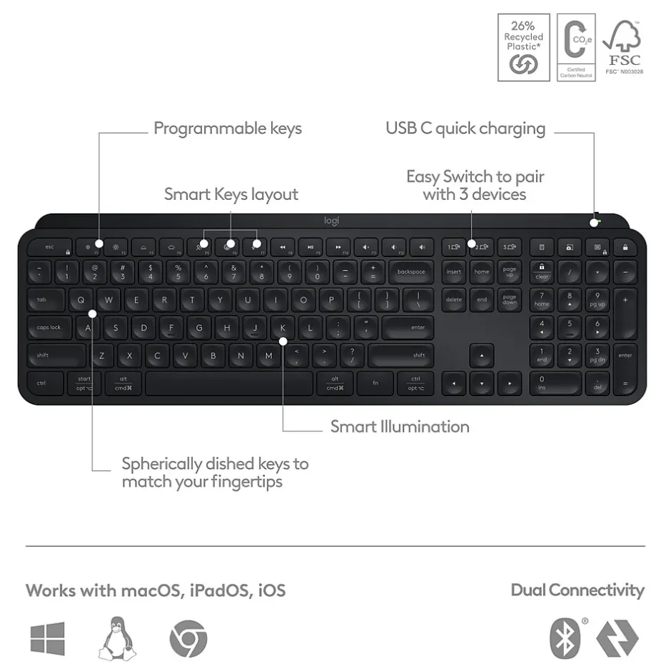 Master your flow like never before with the Logitech MX Keys S, a low-profile wireless keyboard that offers a fast, fluid, and precise typing experience, illumination, and customizable, time-saving Smart Actions. The MX Keys S also features smart backlighting that lights up as your fingers approach the keyboard and automatically brighten or fade to suit the time of day. Now you have more control of your backlighting brightness and duration with the Logi Options+ app.