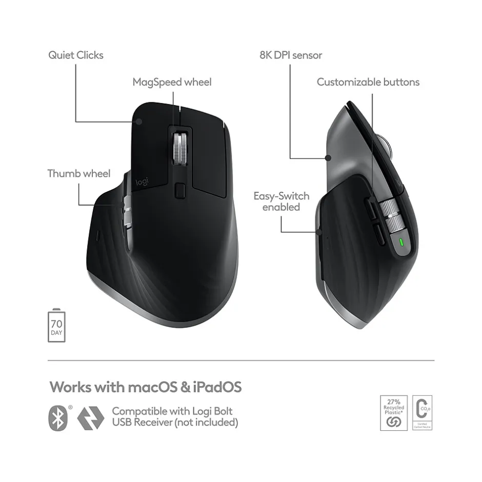 The Logitech MX Master 3S for Mac is an iconic mouse remastered. Optimized for macOS and works with iPadOS. Quiet Clicks technology delivers a satisfying tactile feel with 90% less click noise. The MX Master 3S for Mac also includes an 8000 dpi track-on-glass sensor and MagSpeed wheel for ultimate precision. Logi Options+ enables Flow cross-computer control and enables app-specific customizations. The MX Master 3S for Mac stays powered many days on a full charge and delivers three hours of use from a one minute USB Type-C to Type-C quick charge.