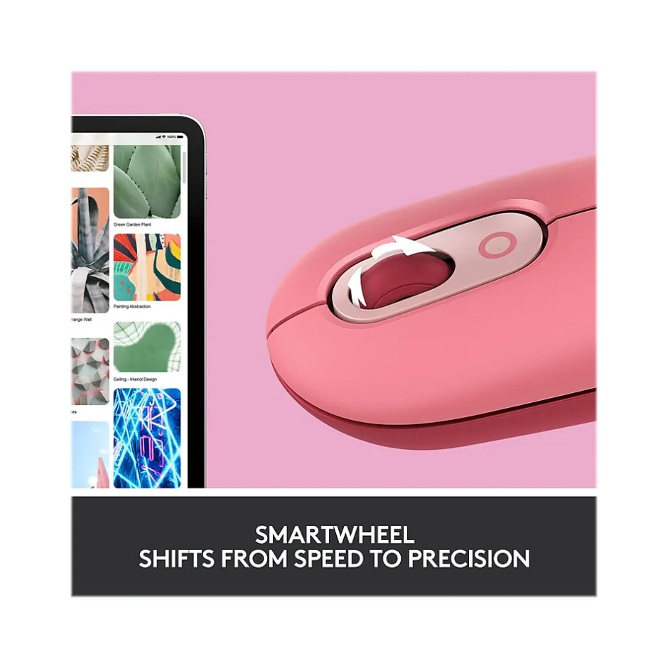 Get to know the playful wireless Logitech POP mouse designed to make personality shine on your desktop and beyond. Pick the Logitech POP mouse you love most from the range of designs, and make it your own with fun emoji customization. With SilentTouch clicks, and a battery life of up to 24 months, take it anywhere you go. Connect the mouse to your desktop, laptop, or tablet using Bluetooth on Windows, macOS, iPadOS, and Chrome OS. Glide between up to three devices at a time with Flow, and shift instantly from the high-precision to speed scroll mode with the SmartWheel.