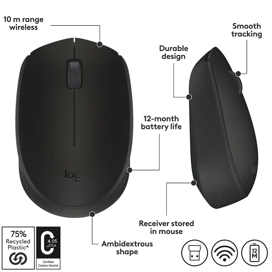 Logitech M170 has strong and consistent wireless connection from distances up to 10 m away. With virtually no delays or dropouts, you’ll work and play with confidence. Just insert the receiver into a USB port on your computer and begin using it right away. There is no need to pair the mouse or to download software in order to begin using it. It is really comfortable and mobile. The shape of the mouse supports your hand for hours of comfortable use.