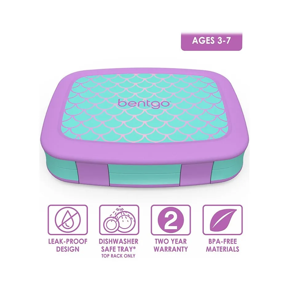 - Bento-style lunch box for kids features compartments for fruit, veggies, dip, entree, and dessert