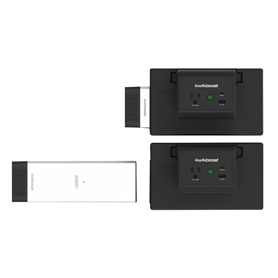 Enjoy the convenient cordless charging of mobile devices. The Luxor KwikBoost EdgePower desktop charging station system is a total solution for laptops and mobile devices in workspace and classroom environments. The system eliminates extension cords by putting power right where you need it. The KwikBoost EdgePower light-use bundle includes three rechargeable batteries, three clamp-on desktop charging units, plus a three-bay base charging station. This system is perfect for medium-size rooms where users require frequent access to supplemental power. Each clamp-on desktop charging unit features an innovative design that easily attaches to most tables and desktops. Once connected, each unit offers a standard AC outlet, a USB Type-A charging port, and a USB Type-C PD charging port.