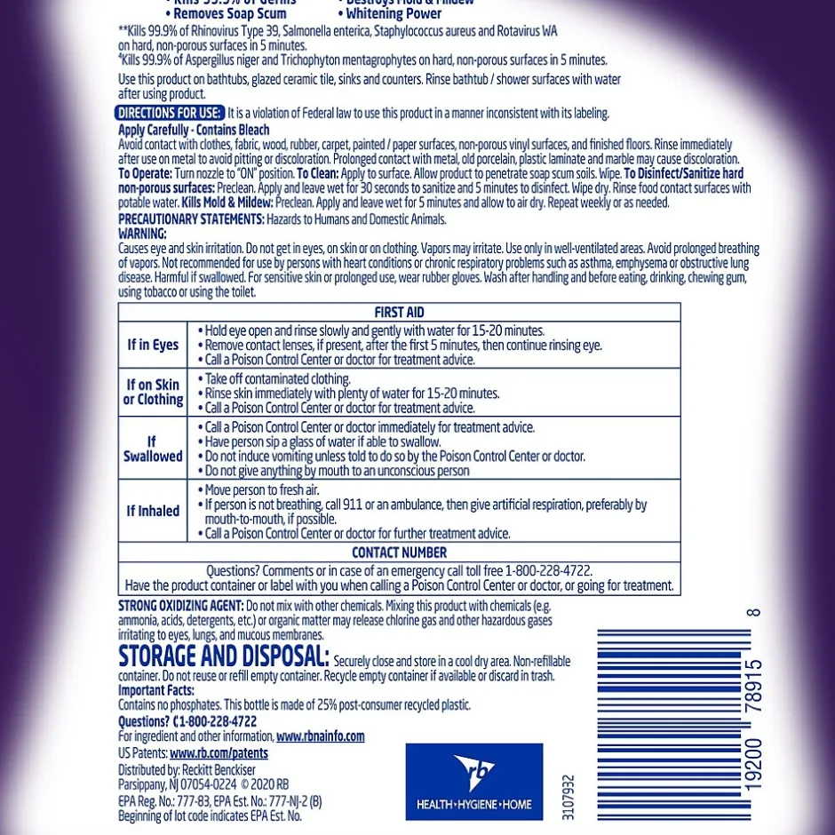 - With added bleach, this powerful cleaner kills 99.9 percent of viruses and bacteria and whitens bathroom surfaces to a sparkling finish.