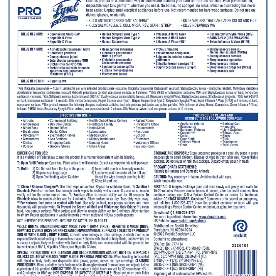 | Number of Wipes per Container The time it takes for the chemical to kill germs and bacteria (also known as the “wait time”). | 15 |