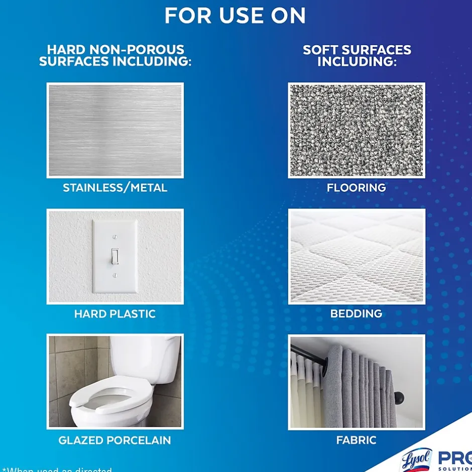 Lysol® kills 99.9% of viruses and bacteria, including the virus that causes COVID-19 and cold and flu viruses when used as directed. Help protect high-traffic areas and high-touch surfaces, including desks, bathrooms, doorknobs, and railings. Deliver hospital-type disinfection into soft surfaces, including upholstery, curtains, sofas, mattresses, and cushions. Meet customer and staff expectations around disinfection. Simply spray and let air dry.