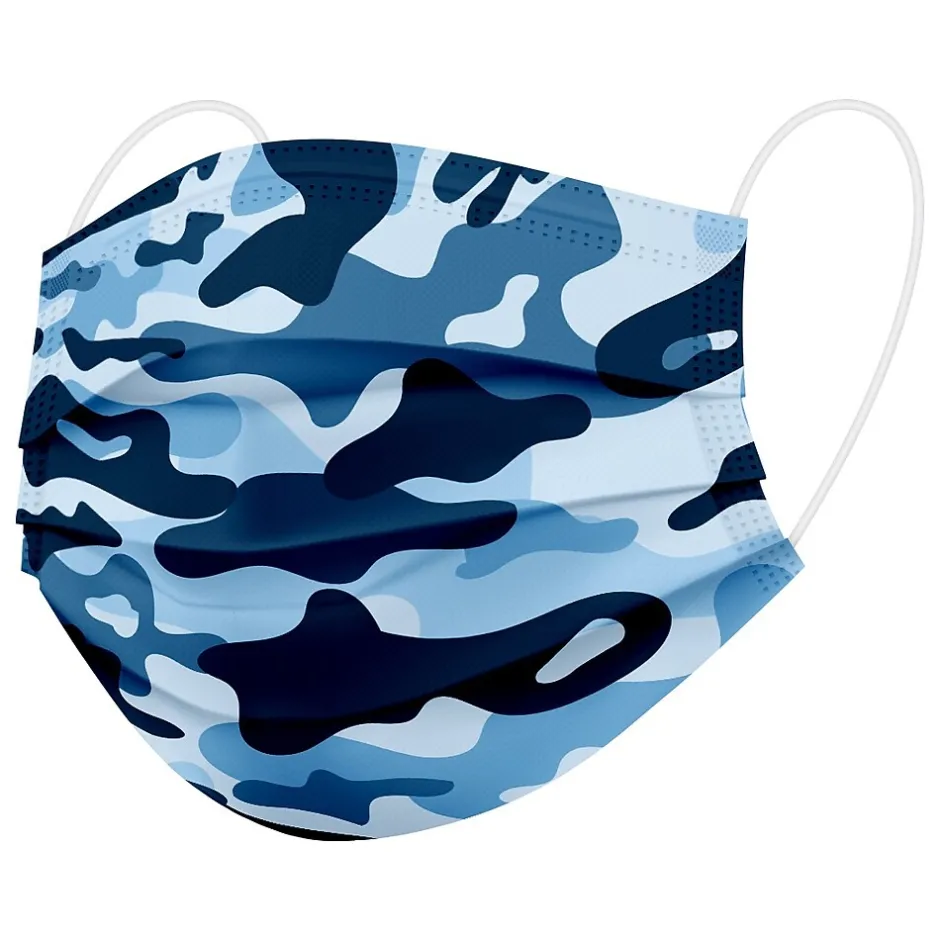 - Offers full coverage of the nose and mouth and comes in white and blue camo