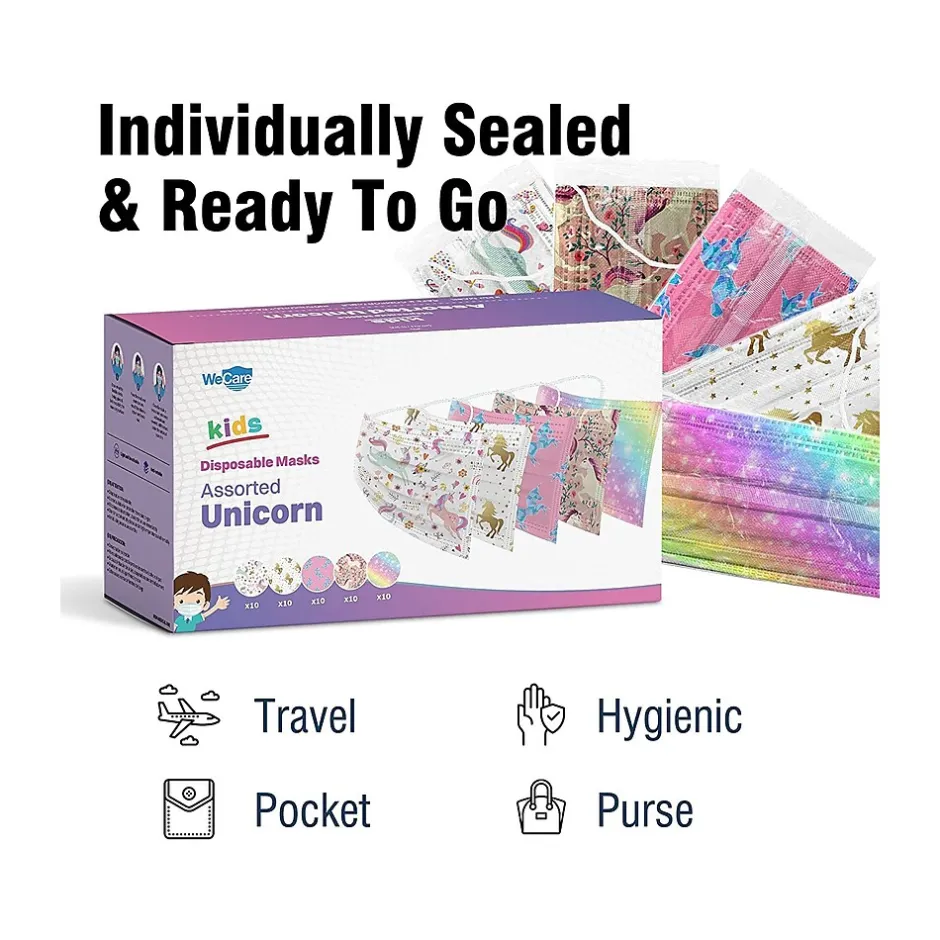 - Adjustable metal wire runs along the top as a nose clip; the masks come in assorted unicorn designs