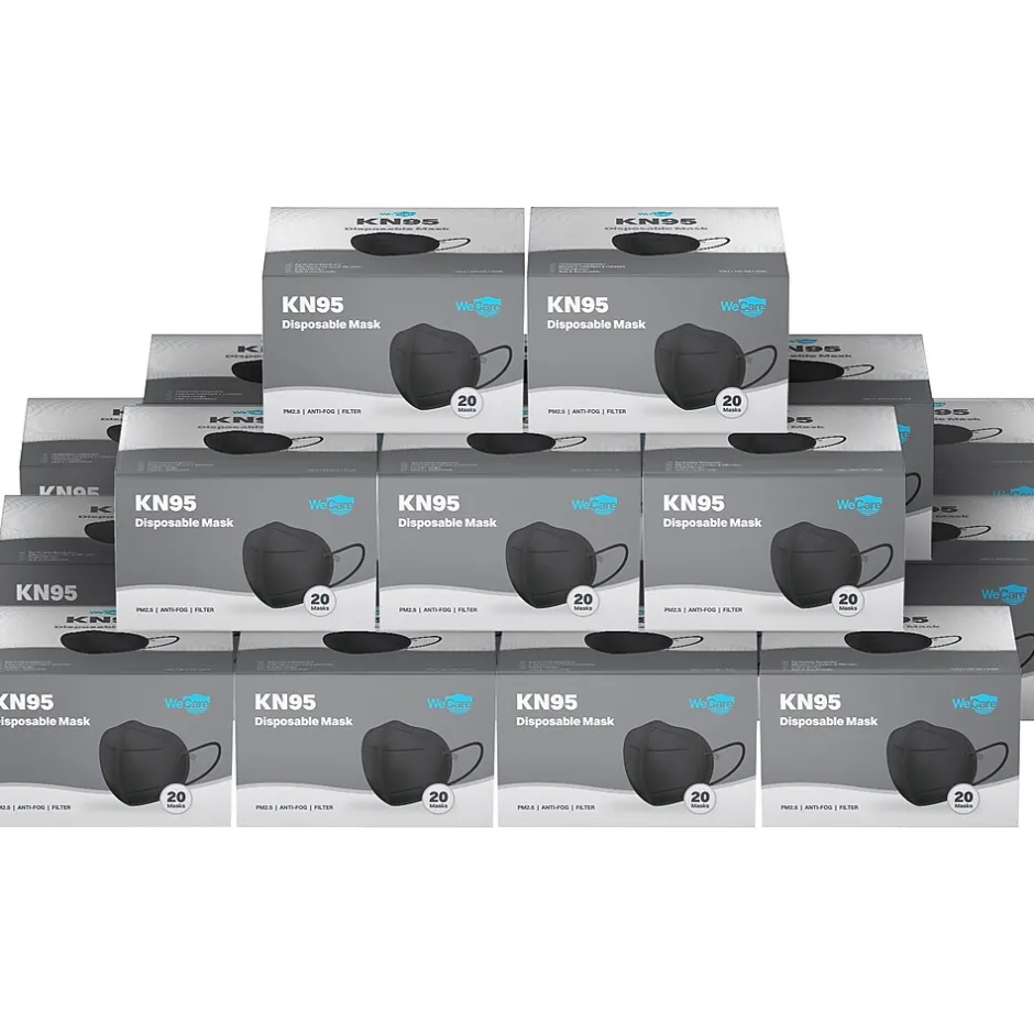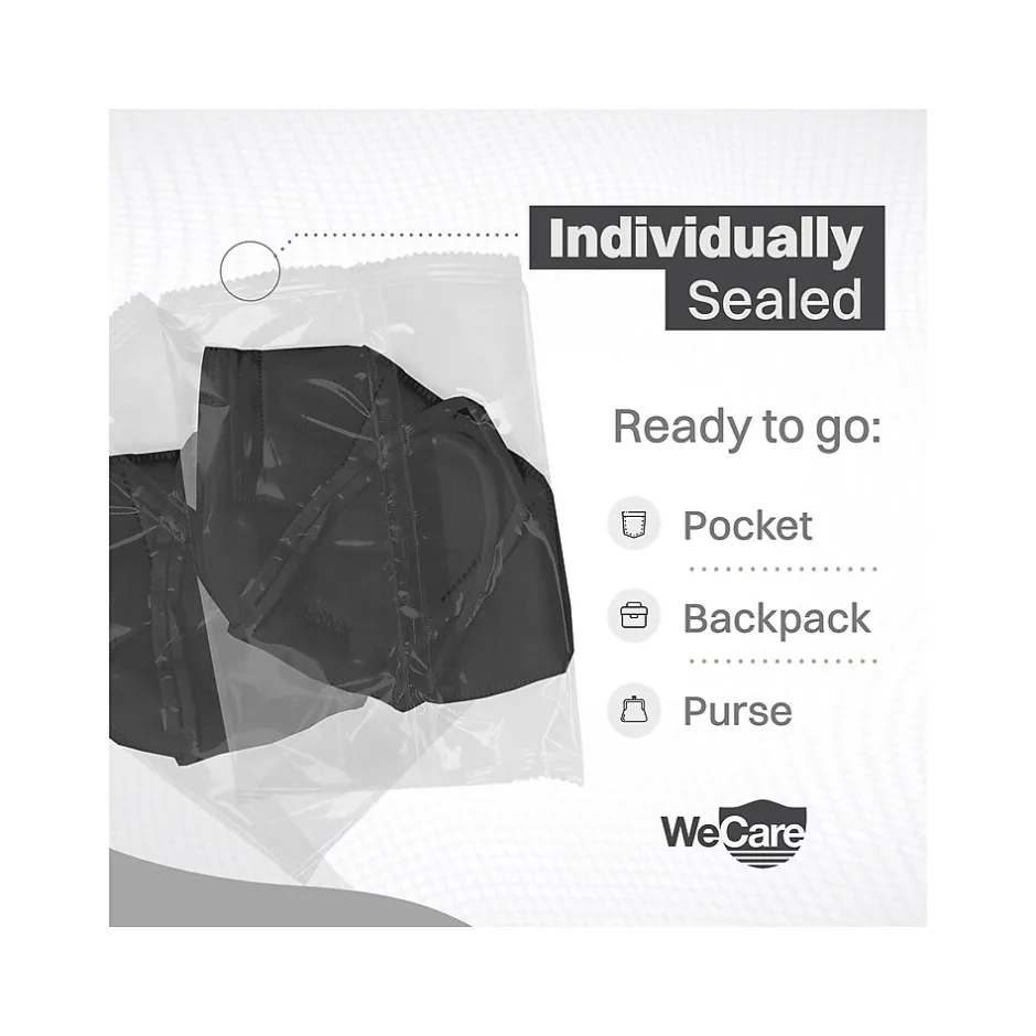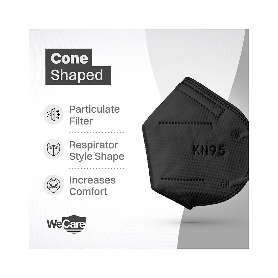 These protective disposable face masks by WeCare are comfortable, breathable, and foldable. The cone-shaped masks offer five-ply protection. The elastic fabric completely fits the face. Inner layer with soft materials contacts your face for comfortable user experience. Suitable for different face shapes. Each mask is individually packaged from the manufacturer for added protection and sanitary use.