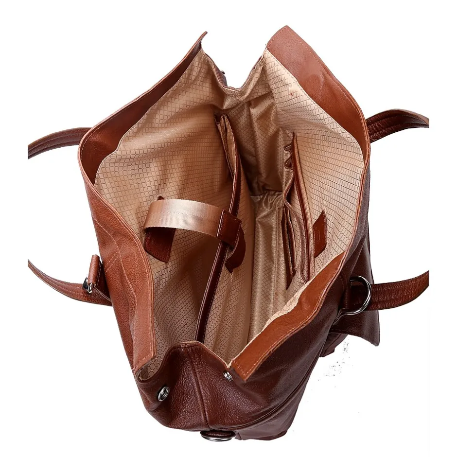 Leather Roll Top Laptop Briefcase with dual clasps closure. Front easy access pocket with flap over magnetic closure. Fully-lined interior with leather trim and silver accent hardware. Interior compartment features built-in laptop protection, tablet pocket and organizer for business cards, pens, and accessories. Back features secured zipper pocket. Removable and adjustable nylon strap with leather shoulder pad. Leather smart strap for piggy-backing onto rolling cases.