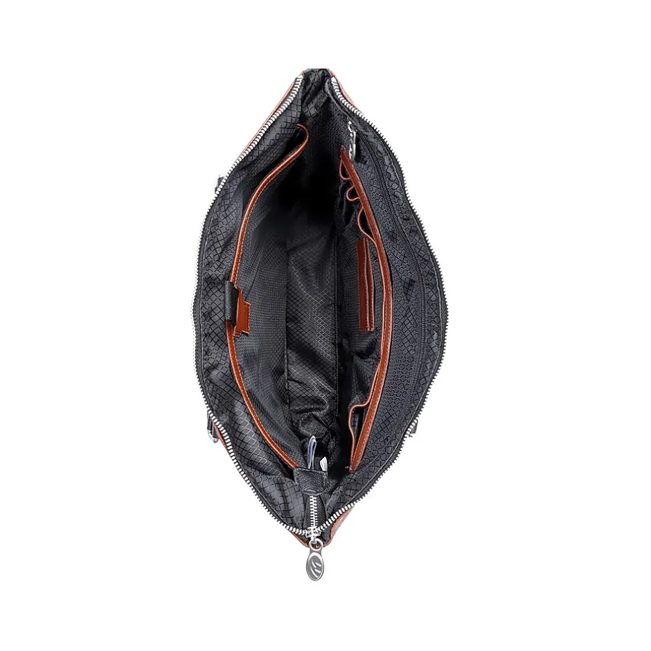 Carry all your important devices in this McKleinUSA EASTWARD U Series leather laptop and tablet briefcase designed with elegant contrasting leather accents. Conveniently access your essential items safely in its hidden full-length front zipper pocket. Its fully lined interior is accented with leather trim and silver hardware securing your items with lockable zipper. Well-designed full-length interior zipper pocket and business accessory organizer help make your day go smoothly. Exterior back zipper pocket for easy access to your most needed items (cellphones, keys, and more). Transport in comfort with the removable non-slip contour-padded shoulder strap, and set it down with confidence on five protective metal feet.