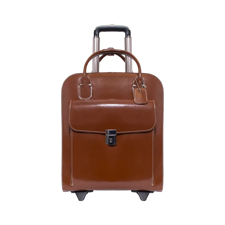The UPTOWN by McKleinUSA is a wheeled ladies’ laptop briefcase made of leather. Its vertical design allows you to easily roll the case in tight spaces like airport aisles, trains, and buses. The quick-access front pocket secured by a flap features a key lock. The interior organizer has storage space for media devices, business cards, key holder and pens. The built-in high-density laptop compartment protects laptops up to 15″ in size. The smart attachment strap allows transport on extended handles of other rolling cases and luggage.