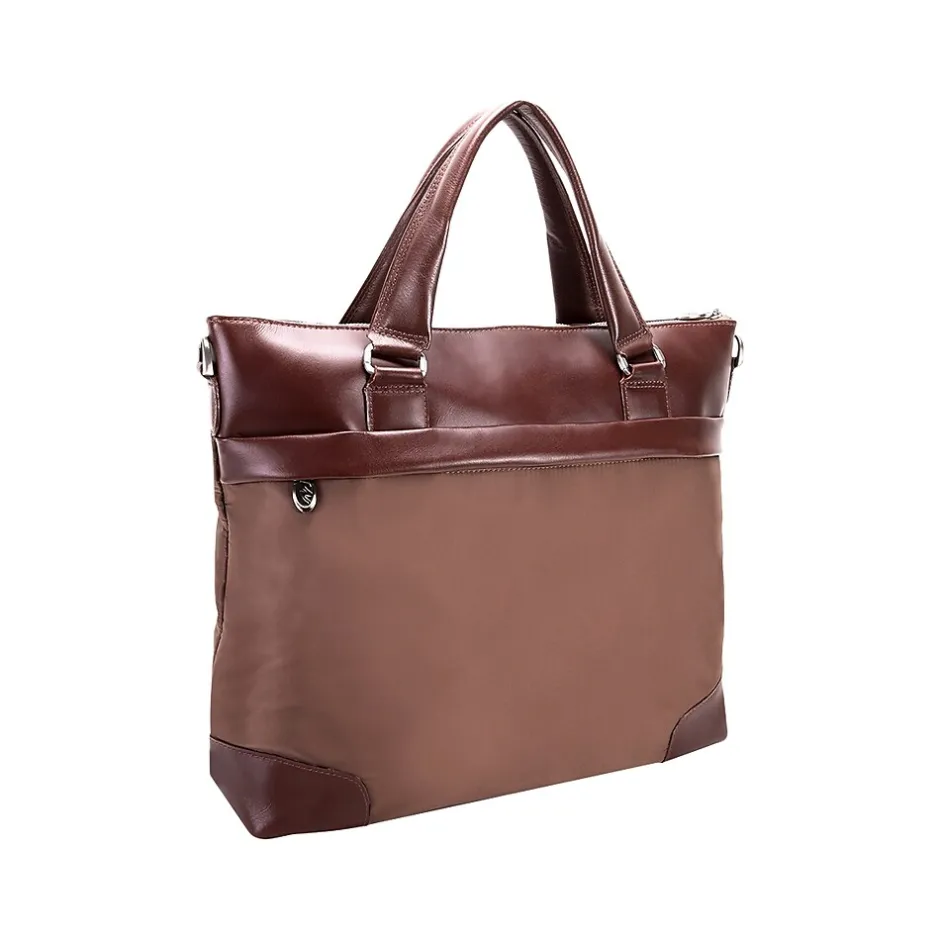 The EASTWARD by McKleinUSA is a modern nylon briefcase with leather accents. It has a fully lined interior with a padded laptop compartment. This briefcase also features an exterior front zipper file pocket and a removable and adjustable nylon strap with a leather shoulder pad.