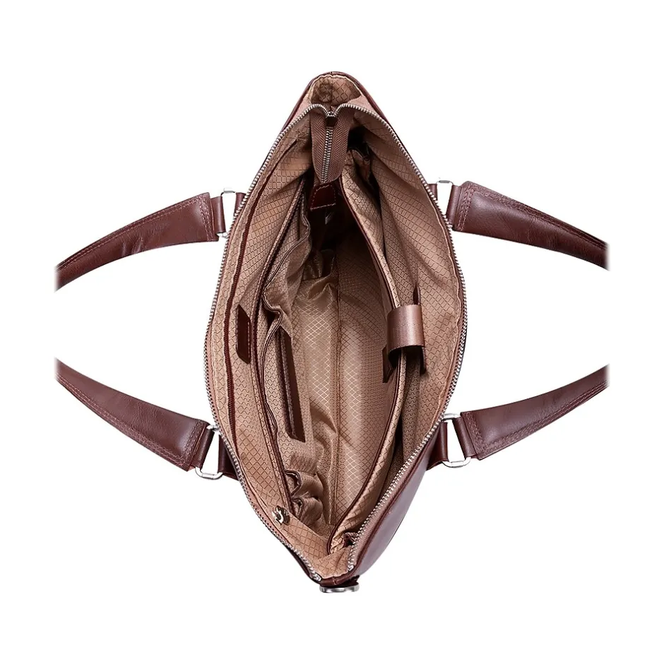 - Interior features organizers for pens, business cards, and accessories, a laptop section, and a secure full-length zippered pocket