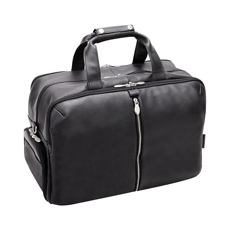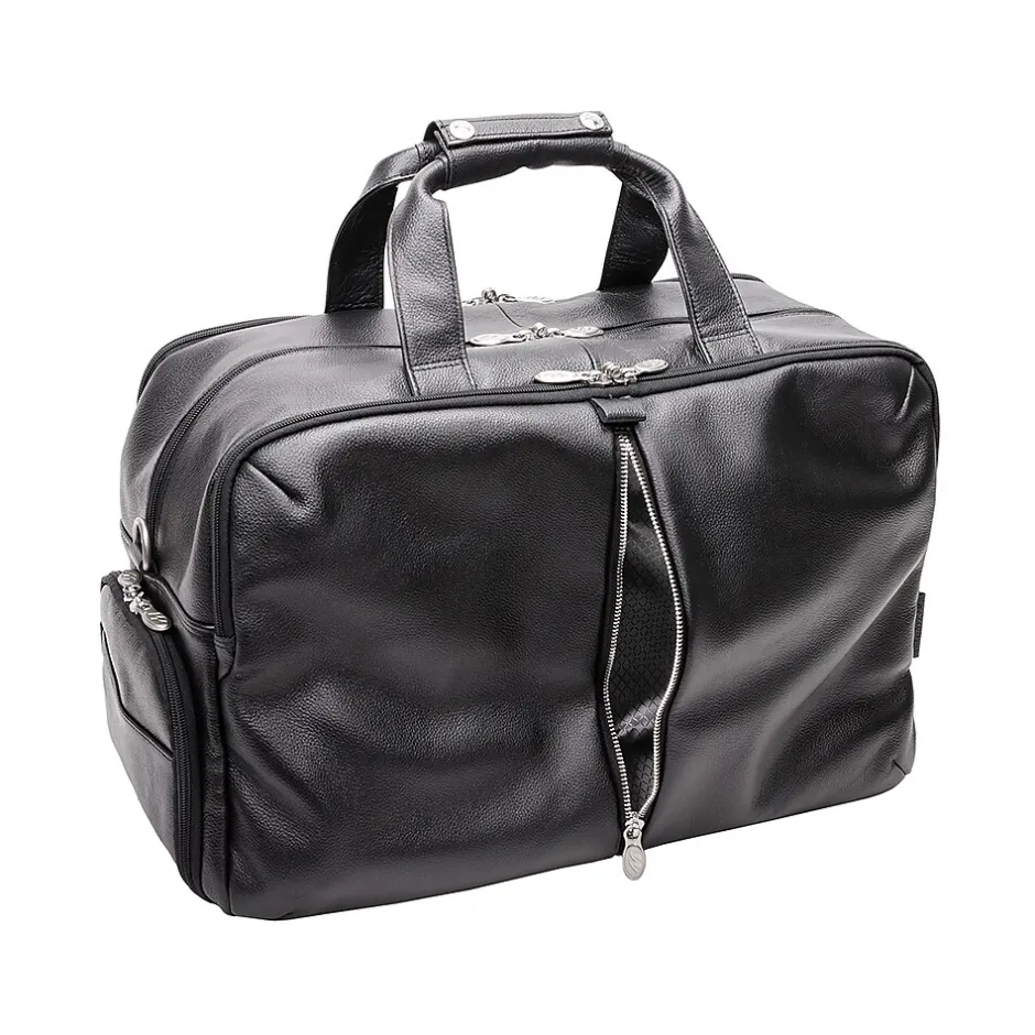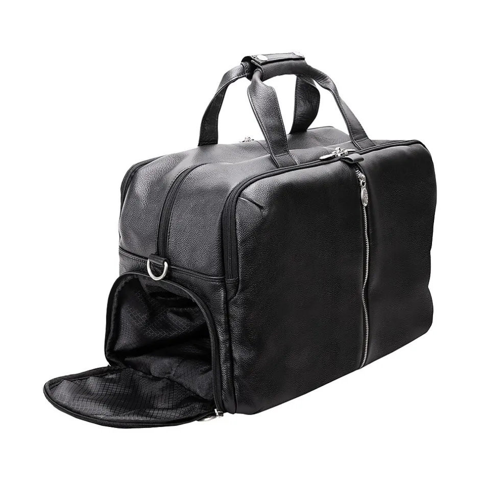 A true modern all-purpose McKleinUSA U Series AVONDALE 22″ travel duffel bag is capable of carrying everything in its spacious compartments. Carrying in comfort and stability with the conveniently designed double snap handle wrap. Easy access to travel essentials through the full-length front vertical zipper compartment. The bag is fully lined with leather accents and silver hardware to make storage easy and pleasant. You can keep your cell phone and keys in the front compartment’s business accessory organizer. The middle compartment is amazingly roomy with front and back elastic pockets to store your toiletries and shoes. The back compartment features a 17″ laptop/tablet pocket and a file divider to keep all your important devices and documents secure. Carry in comfort with the full-length, adjustable, non-slip, detachable leather padded shoulder strap. Set it down with confidence on five protective feet. Convenient side shoe pocket for extra kicks and comfort.