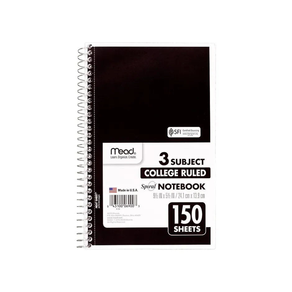 Keep important notes, assignments and other information in one convenient place with this college-ruled notebook. With a compact design, this notebook offers simple portability, and the included three dividers separate sections, so you can easily keep homework, appointment notes and other projects neat and organized. This Mead Spiral assorted-color notebook has 150 sheets of paper and a spiral binding, providing smooth page turning.