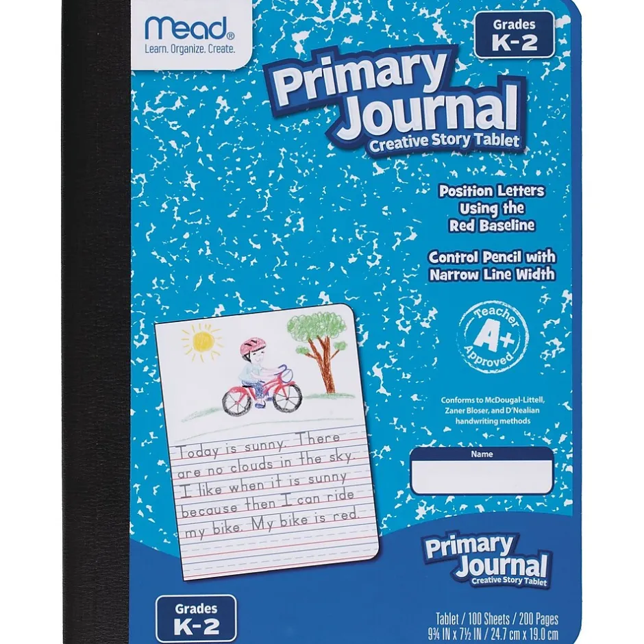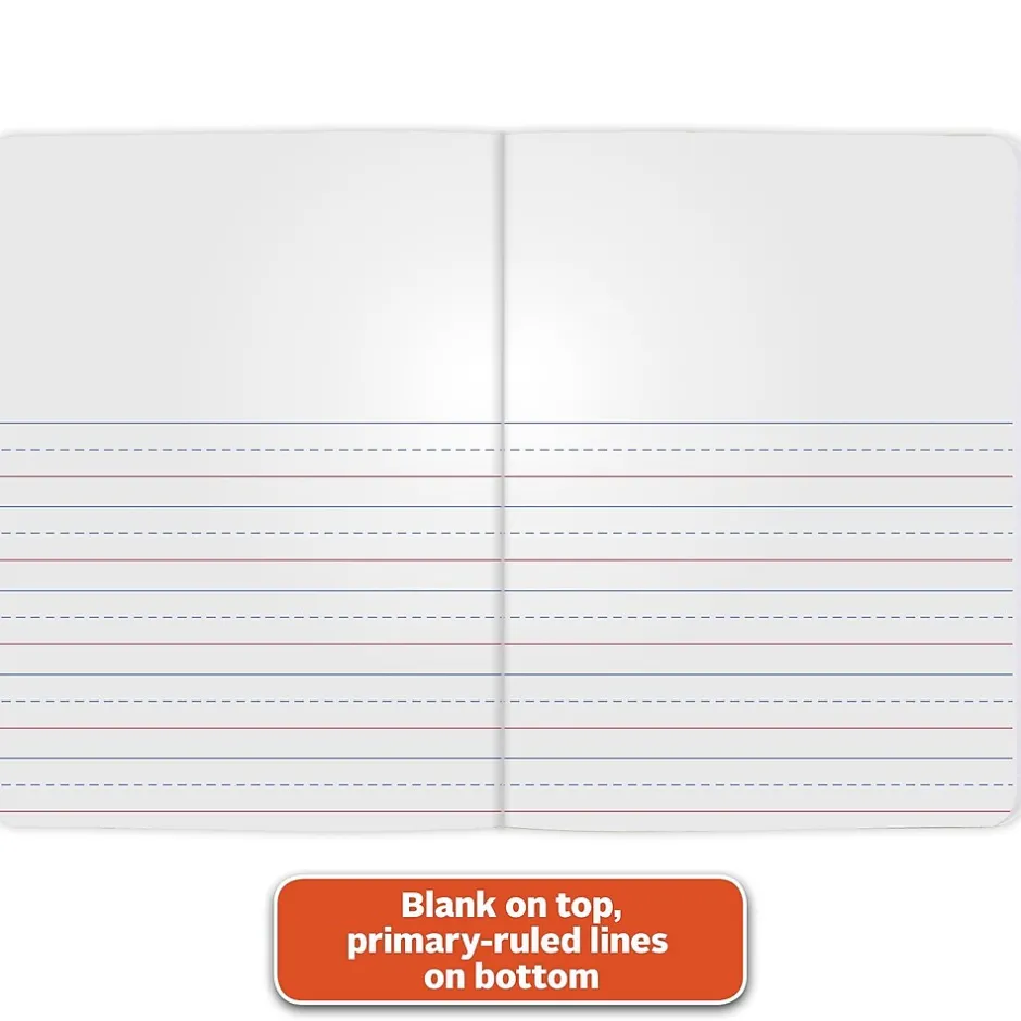 Create stories and draw pictures with this white primary journal. The wide-ruled spacing and guide marks help children learn how to write letters, while the large margin at the top of each page provides plenty of room for writing titles and creating illustrations. This Mead Grades K-2 Primary Journal wide-ruled primary journal conforms to Zaner-Bloser, McDoughal Littell and D’Nealian handwriting methods, making it ideal for use in kindergarten, first grade, and second grade classrooms.