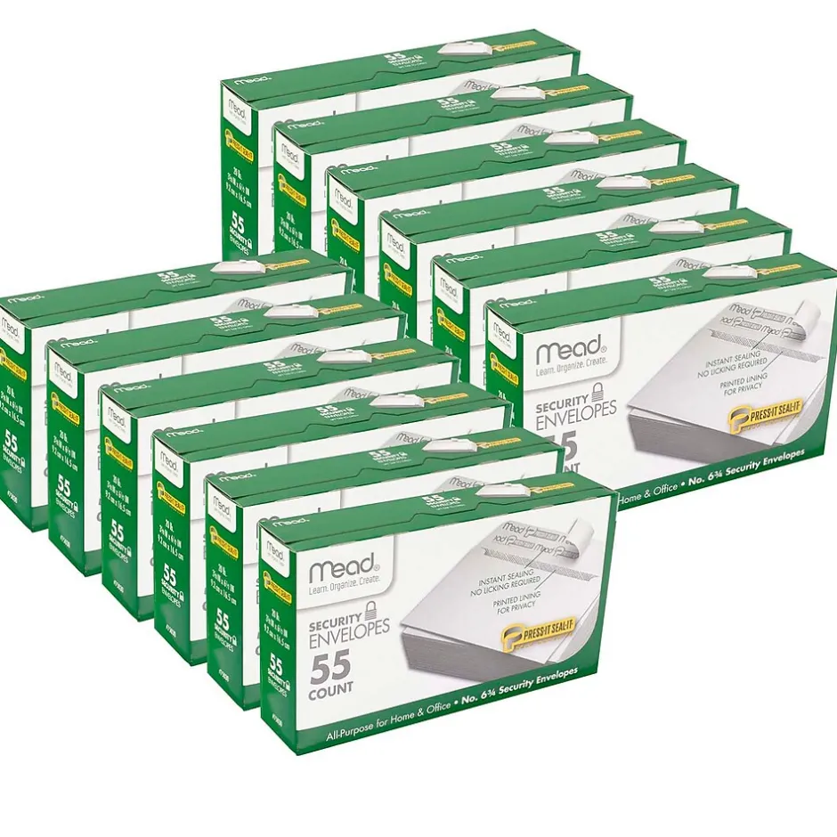 Mead #6 3/4 Press-It Seal-It® Security Envelopes feature a self-adhesive seal and a security lining to ensure privacy. The #6 3/4 size envelopes measure 3.625″ x 6.5″. Includes 55 white envelopes per box. Sold as 12 boxes for a total of 660 envelopes.