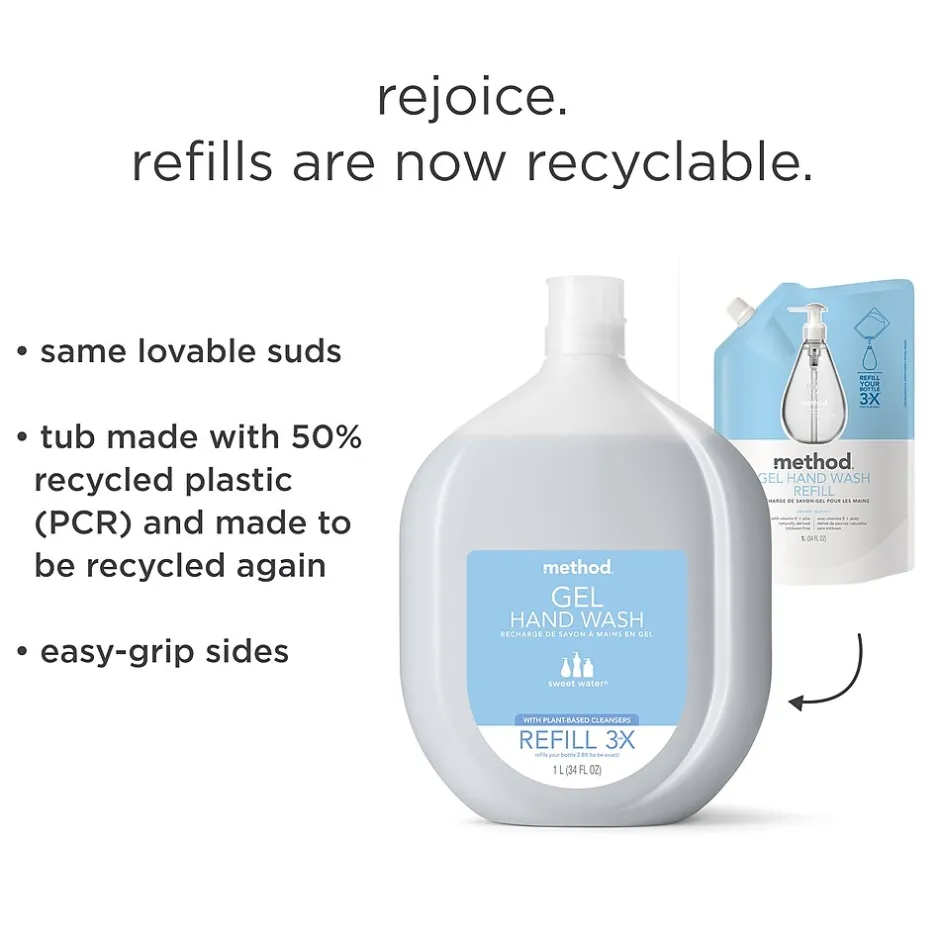 The Method hand soap refill is full of naturally derived gel hand wash to refill your bottle nearly three times. Because the only thing worse than dirty hands is employing jeans-wiping as an interim solution. This adorably cubby tub packed with plant-based grease-cutting power is made with 50% recycled plastic and designed to be recycled again. It’s a sudsy cycle of goodness. Easy to use: remove the lid from your gel hand soap bottle, and carefully refill, leave about an inch at the top if you have a pump bottle. Replace the lid, pump a few times, and you’re back in dish business.