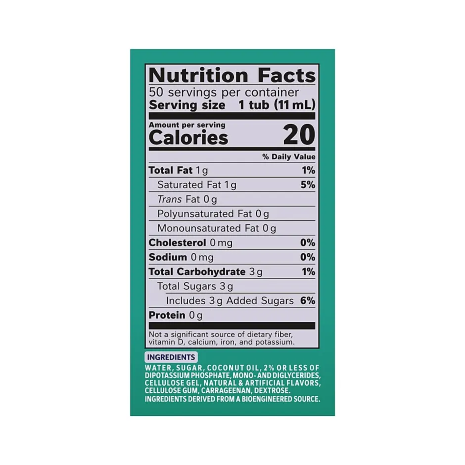 - Ingredients: water, sugar, coconut oil, 2% or less of dipotassium phosphate, mono- and diglycerides, cellulose gel, natural and artificial flavors, cellulose gum, carrageenan, dextrose