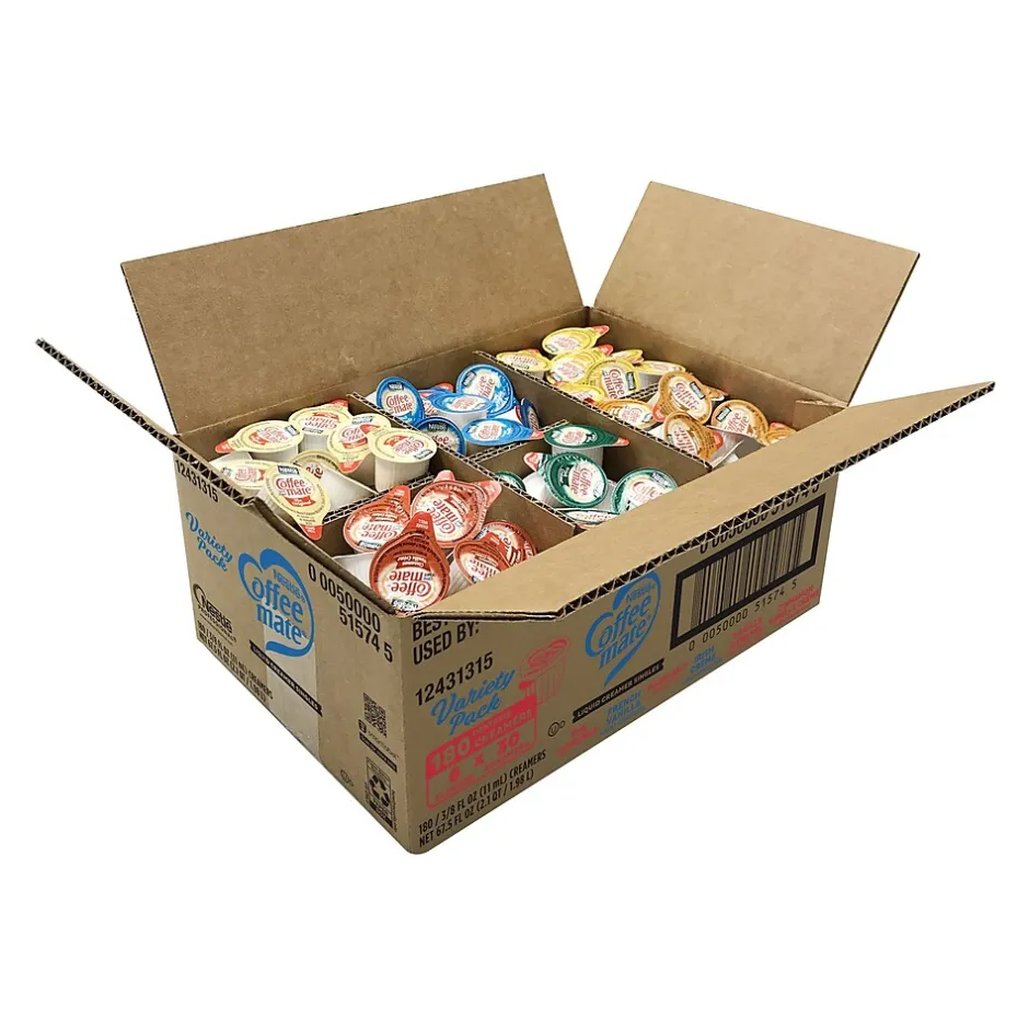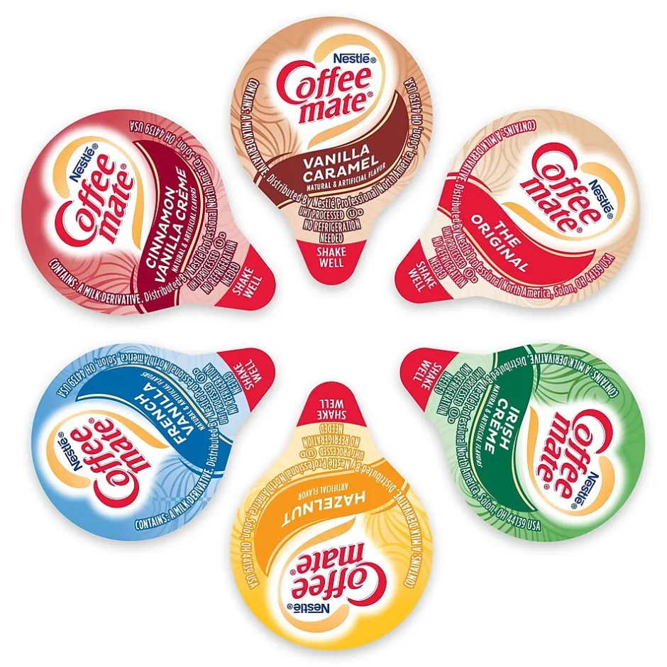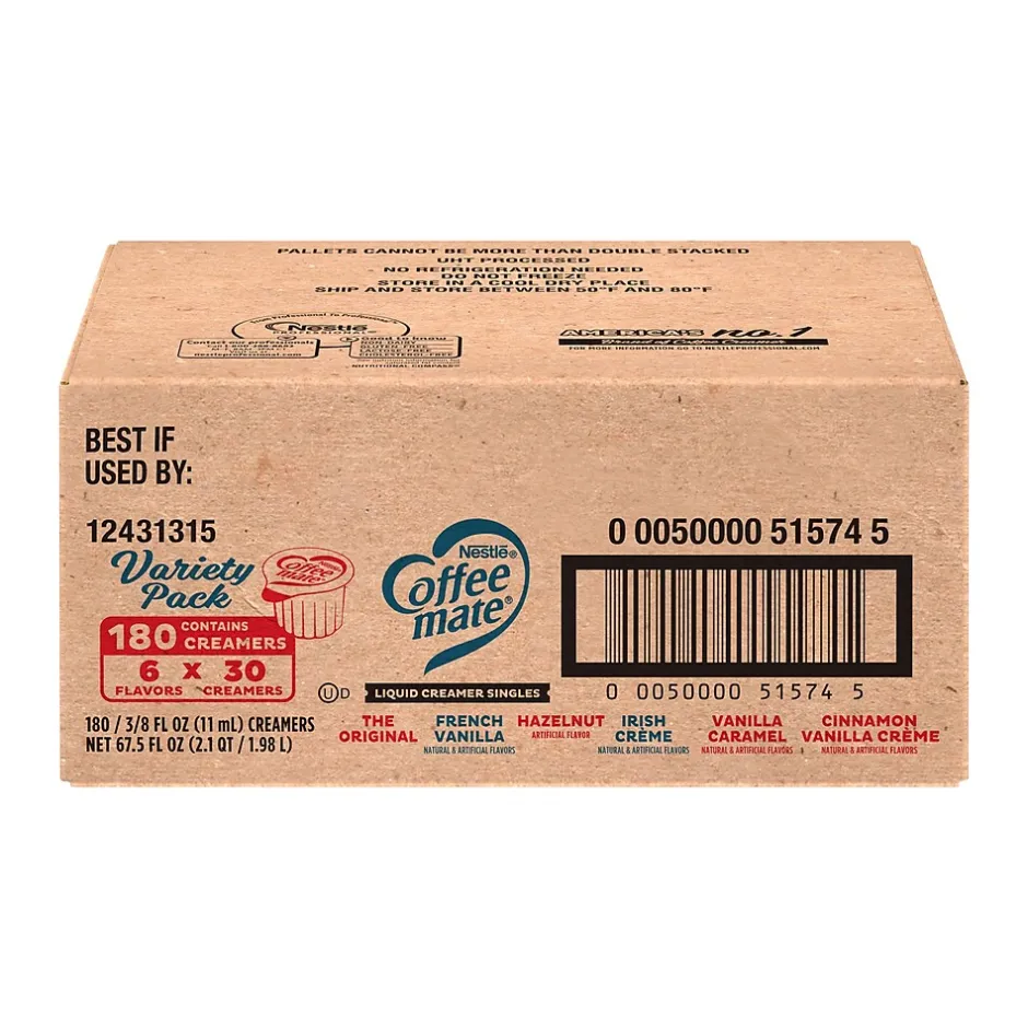 Add variety to your coffee routine with the creamy, rich flavor of your favorite Coffee mate liquid creamer singles including French vanilla, hazelnut, original, cinnamon vanilla, Irish creme, and vanilla caramel. The convenient, portable tubs give you the freedom to take a break where and how you like. Serve and enjoy Coffee mate’s top six flavors from one convenient variety pack (30 counts of each flavor). These creamer singles don’t need to be refrigerated and can retain their irresistible flavor at room temperature for up to nine months prior to opening. Easy to use: just shake, open, and pour.