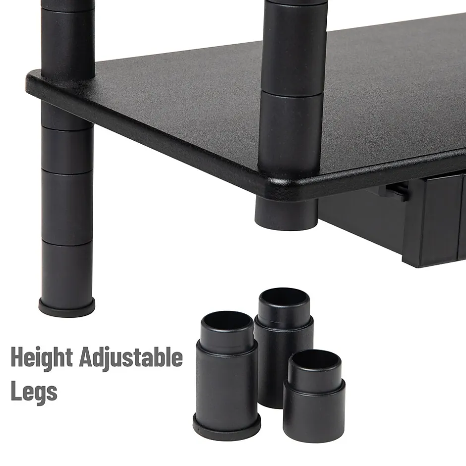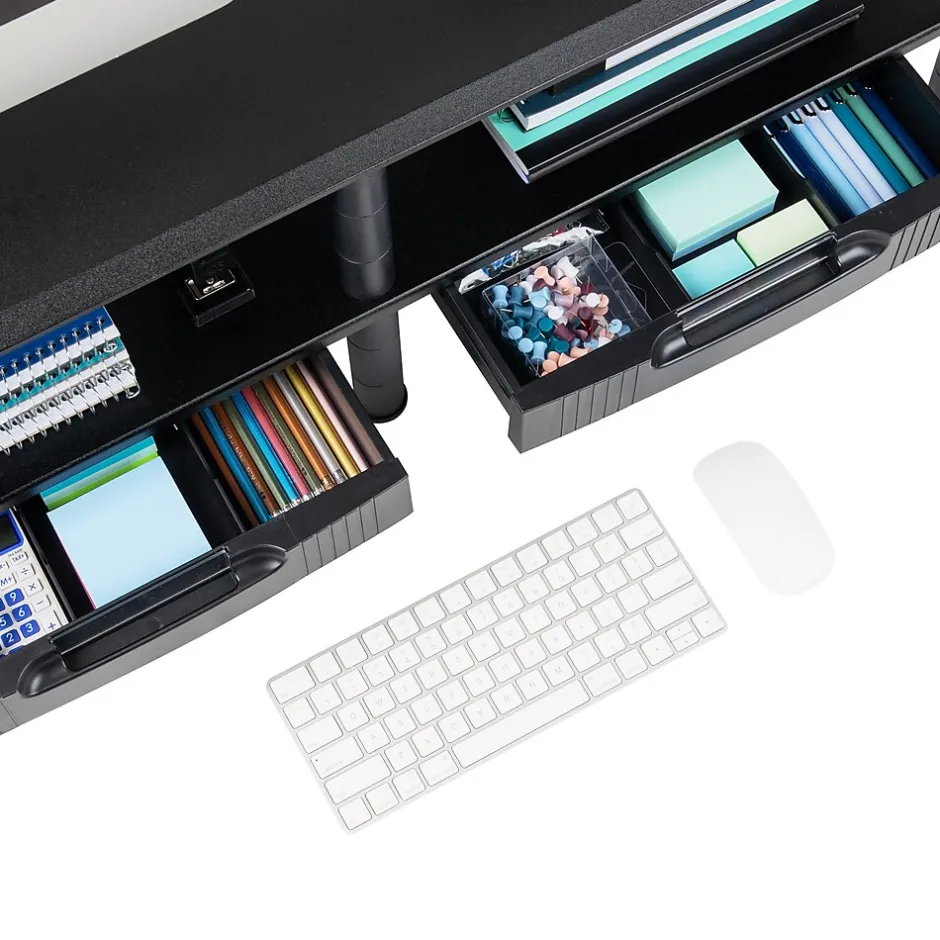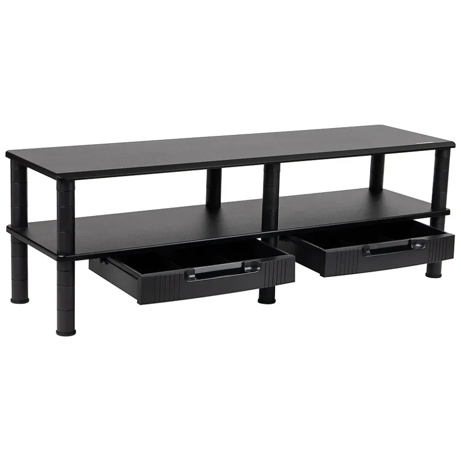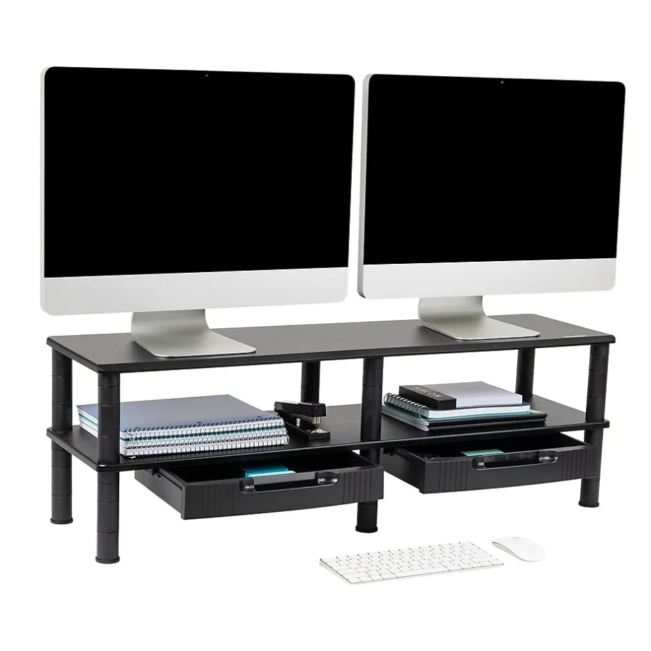 Experience enhanced comfort and improved organization with our 2-tier monitor stand. Designed to lift your laptop or monitor to a comfortable viewing height, this stand helps reduce neck and eye strain and improves your overall posture during prolonged computer use. This multi-purpose stand comes with open shelves and drawers on each side, providing ample storage space for your books, computer accessories, or any other essentials. With its compact design, it’s a perfect solution for those looking to create vertical storage in small spaces like home offices or student dorm rooms. Lightweight and portable, this stand is easy to transport from one place to another, making it a versatile accessory for both students and professionals. It is constructed from durable plastic that can be easily cleaned with a damp cloth. Assembly is simple, with clear instructions included. Whether you’re a student heading off to college, a remote worker in need of a home office upgrade, a teacher, or a coworker managing a dual-monitor setup, this stand makes for an ideal gift. By decluttering your workspace and elevating your monitor, it makes work or study more productive and less straining on your body.