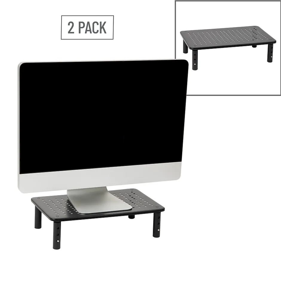 Transform your workspace with this set of two space-saving monitor stands. Whether you need a base for your computer monitor, flat-screen TV, or laptop, this stand is the perfect solution. Crafted from sturdy metal, it is lightweight and easily portable. With a weight capacity of up to 44lb (20 kg), it can comfortably support your devices.The stand features a ventilated design that allows air to circulate underneath your electronics, preventing overheating and enhancing performance. For added security, non-slip feet ensure the stand stays firmly in place. The added height allows you to adjust the viewing angle of your screen, minimizing strain on your neck and back. Work or game for longer periods without the discomfort that comes from poor posture.But that’s not all. This stand doubles up as a storage solution, providing ample room underneath to store office supplies, folders, and papers. By elevating your monitor, it helps declutter your workspace, creating a more organized and productive environment.This monitor stand makes an ideal gift for students moving into dorm rooms, new homeowners, or anyone looking to upgrade their workspace.