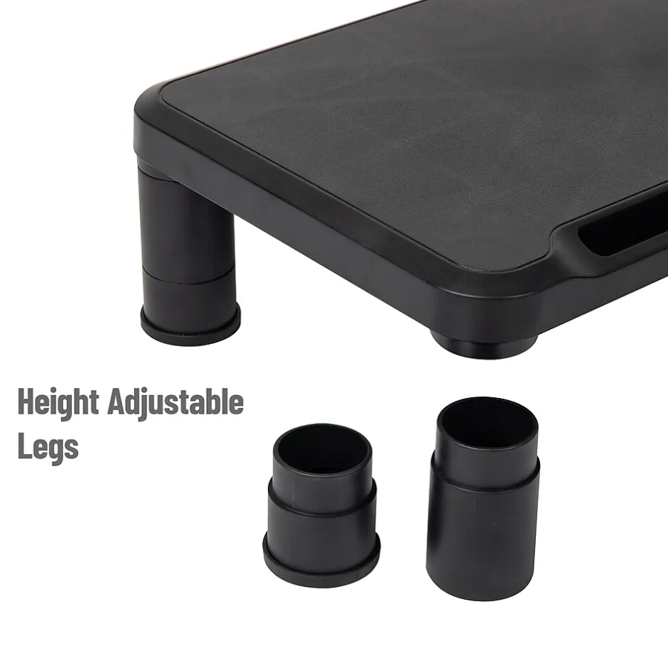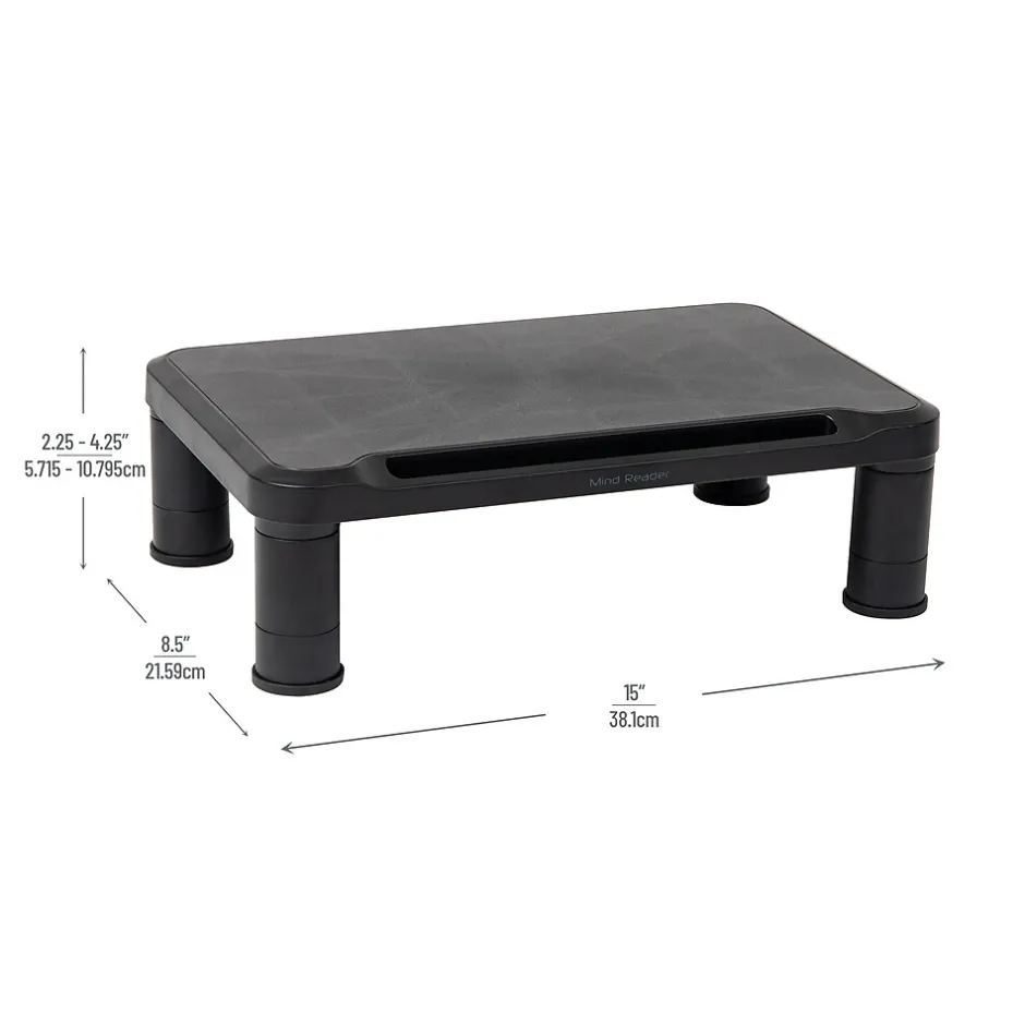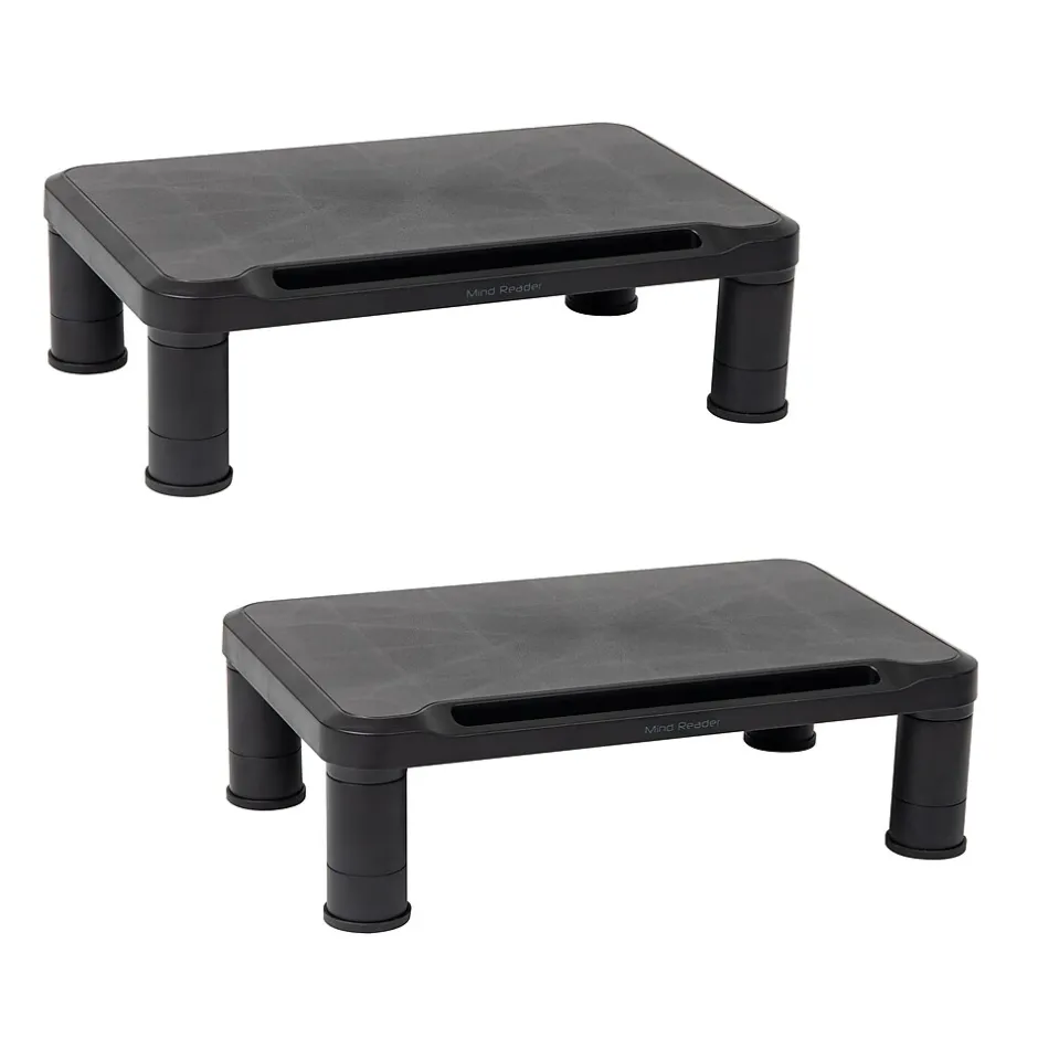 Discover the convenience and improved posture offered by this set of two adjustable monitor stands, perfect for organizing your workspace and supporting your body while you view or work. Use one for your computer monitor and the other for your laptop, TV, or printer, or keep one at home and bring the other to the office.These versatile monitor risers can also elevate your television, phone, or gaming console, adjusting in height from 2 to 5.25 inches to provide optimal support and alleviate eye, neck, and back strain. When not in use, the slim stands are easy to store in small spaces or cabinets, and can be cleaned with a cloth and mild soap/water.Featuring non-slip rubber feet for stability, these sturdy stands keep your devices safe and secure. Consider gifting one of the monitor stands to a friend experiencing eye, neck, or back strain due to poor posture while working. Ideal for dorm rooms and work-from-home setups, these slim stands not only increase available surface space but also promote better posture and overall well-being.