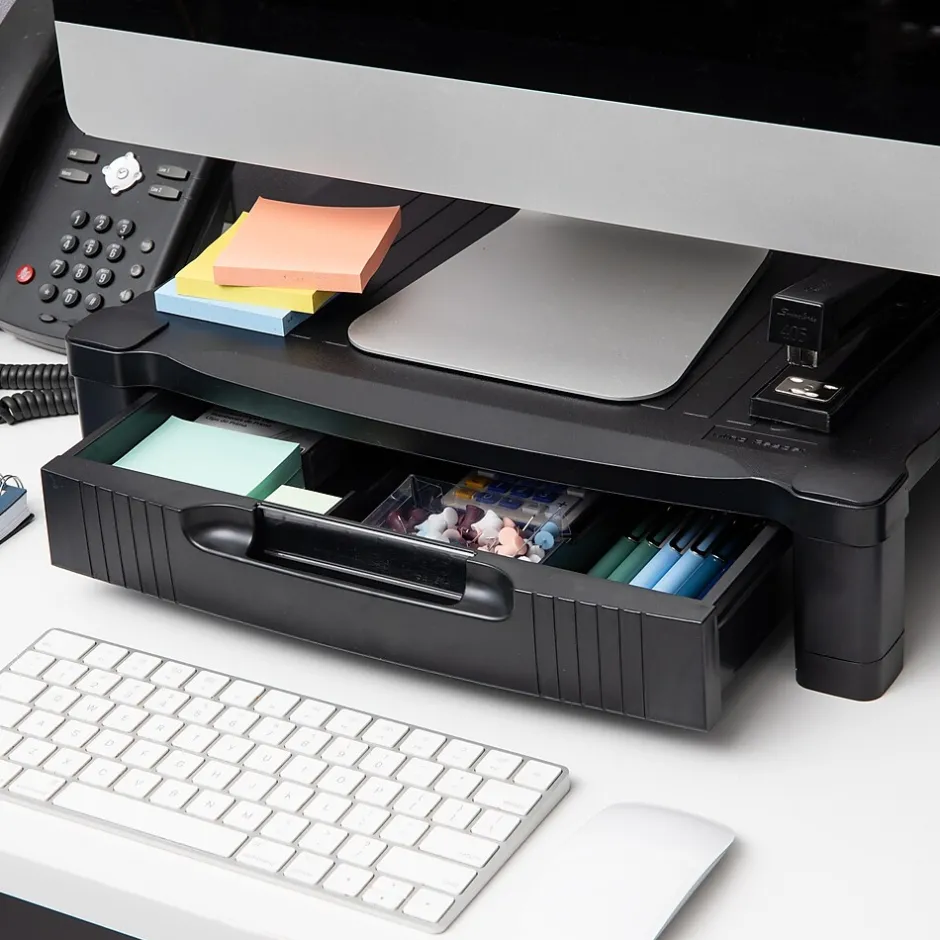 Enhance your workspace with this ergonomic monitor riser designed to alleviate neck, shoulder, and eye strain by raising your monitor to eye level for better posture and comfort. The compact and efficient design saves valuable desk space by providing storage for your modem, notebooks, tablet, and other accessories, while the built-in drawer keeps your documents and essentials organized.Featuring a sleek and modern design, this black monitor stand riser blends in with existing electronics and decor, and the cable management system keeps cords neat and tidy. Built to last with a sturdy resin polycarbonate construction, this stand supports up to 22lb (10kg) and features surface-gripping feet for stability.Measuring 17.25 x 13.25 x 4 inches and weighing 3.48 lbs, the monitor riser stand is ideal for most devices and offers generous storage space for essentials. A perfect gift for students, home or office workers, or anyone with a computer monitor, this riser stand and other Anchor Collection products can transform your workspace into a more comfortable, organized, and efficient environment.
