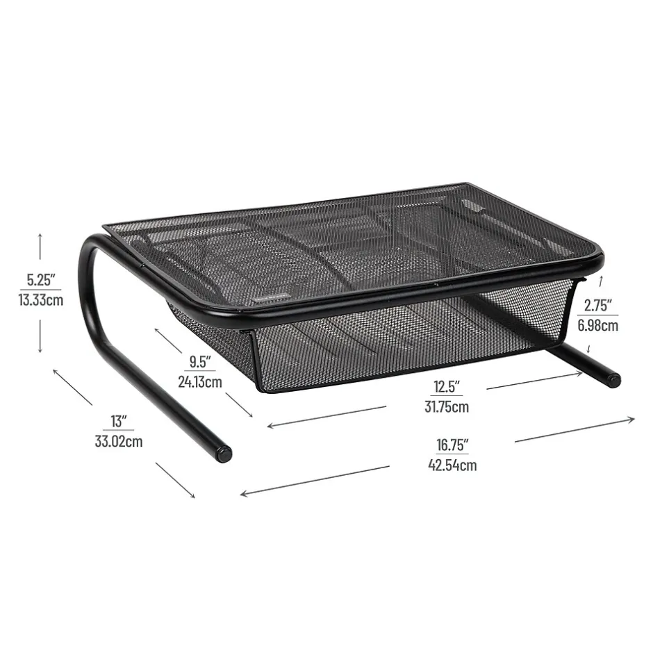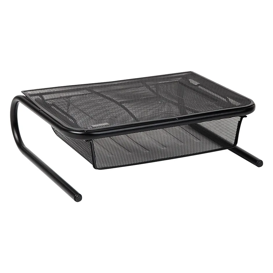 Maximize your work efficiency and reduce discomfort with this ergonomic monitor stand. Elevating your monitor or laptop to the appropriate height helps you maintain good posture, reducing strain and discomfort on your neck and shoulders. The sturdy mesh metal construction of this monitor stand ensures it can withstand the weight of most standard monitors and laptops, making it a durable addition to your workstation.Not only does this monitor stand provide a comfortable viewing angle, it also doubles as a desktop organizer to help you maximize your workspace. With a slide out drawer tucked underneath your monitor, you can easily access and store files, memo pads, and other office supplies. You can even tuck your keyboard under the stand to free up more desk space for other tasks.The sleek design of this monitor stand adds a touch of ambiance to your office, making it a stylish and functional addition to any workspace. The rubber-coated supports on the bottom of the monitor stand keep the it securely in place, while the space-saving design makes it a great gift for anyone in need of a more comfortable and organized workstation.Whether you’re a student, professional, or anyone who spends a lot of time in front of a computer monitor, this monitor stand and organizer is the perfect way to enhance your productivity and reduce discomfort.