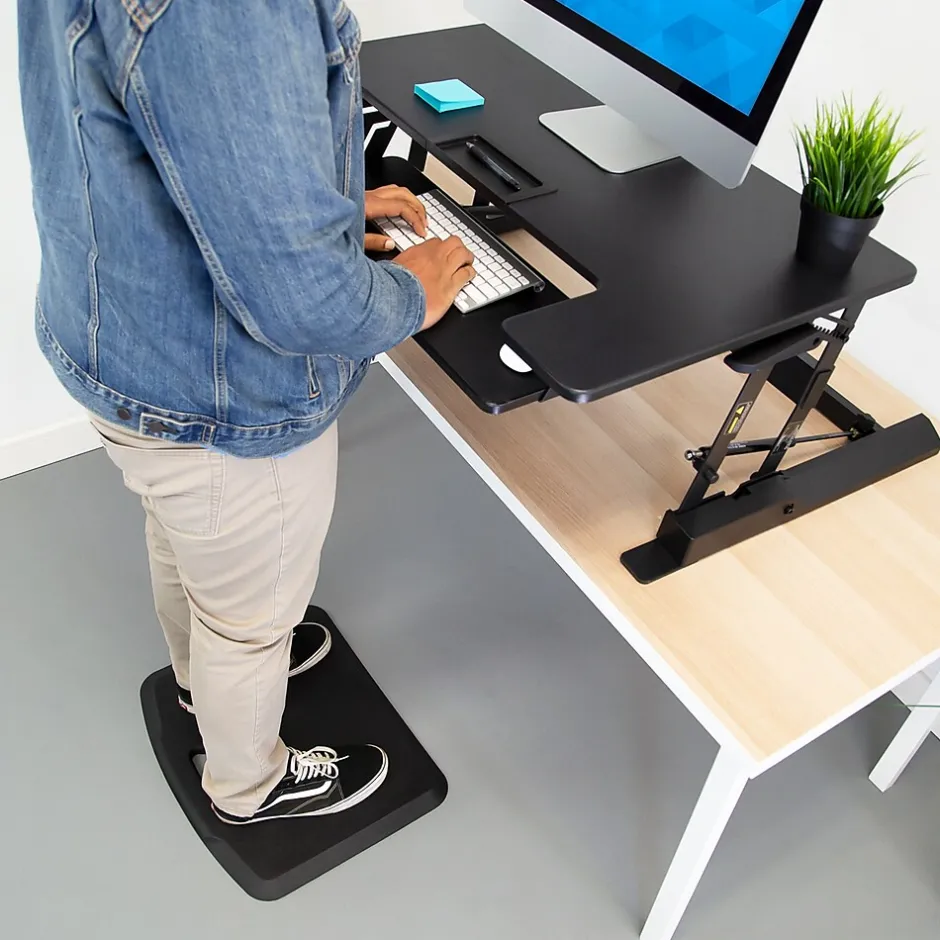 This bundle includes a height adjustable manual sit stand desk converter large enough for two monitors and a soft anti-fatigue mat for more comfort and less pain while standing at work. The Active Essentials Plus ergonomic bundle can easily and quickly turn any existing workspace into a healthier, more active workstation and is perfect for those looking to create a more comfortable and ergonomic work environment. Maintain a healthy balance of sitting and standing throughout the day to increase productivity, boost energy and improve your workflow. Start on the path to a healthier way to work with this ergonomic workstation bundle.The manual height adjustable standing desk converter features a wide 36” tabletop and can adjust from 6.25” to 16.5” high, allowing you to create a customized setup throughout the day.Our anti-fatigue mat is a necessity with any standing desk. The soft cushy floor mat allows you to stand longer at your standing desk without the pain associated with prolonged periods of standing.