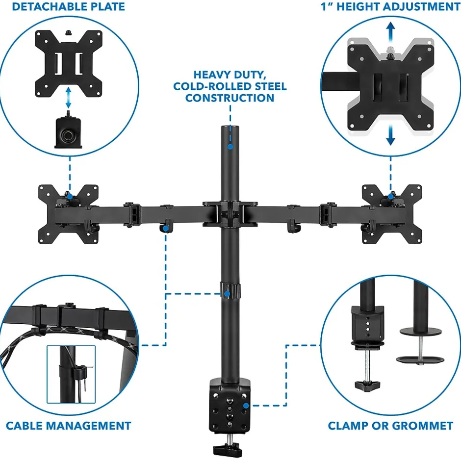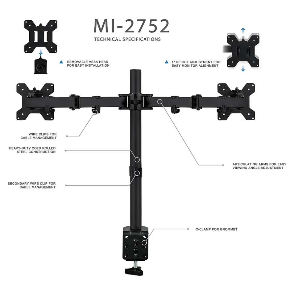 Mount-It! MI-2752 is a dual monitor mount that raises your monitors to an ergonomic position to help you work more efficiently. Designed for performance, this mount is made from high-strength steel for durability and includes both clamp and grommet installation components to fit a variety of desktops. The arms can be raised and lowered on the pole for easy height adjustment. Tilt your screen at 90 degrees up and down or swivel it at 180 degrees up and down to find your most comfortable reading, and integrated cable management keeps your cords off your desktop. All necessary instructions and hardware included.