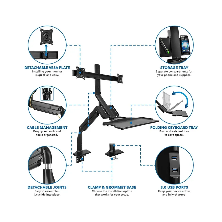 This sit/stand desk mounted workstation turns an existing desk into a more active workspace quickly, with easy installation using a C-clamp or grommet base. Experience a more comfortable way to work throughout the day by adjusting the full-motion fluid gas spring arm and the full-motion monitor mounts. This workstation features two USB 3.0 ports, for charging or data transfer, in the front of the mount, keeping CPU connection within reach and easy to access.