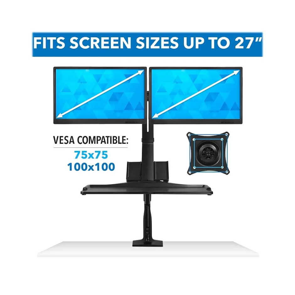- Raise your monitor to a comfortable viewing height with this dual-monitor sit/stand desk mount