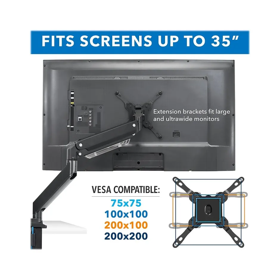 Raise your monitor to an ergonomic position, and free up desk space with this dual-monitor mount. The heavy-duty gas spring arms hold up to 33 lbs. per arm and feature fluid full-motion movements to achieve the perfect monitor placement. The mount includes both clamp and grommet installation options to fit a variety of desks. Tilt and swivel functionality offers multiple monitor angles for comfortable reading, and integrated cable management keeps your cords off your desk.