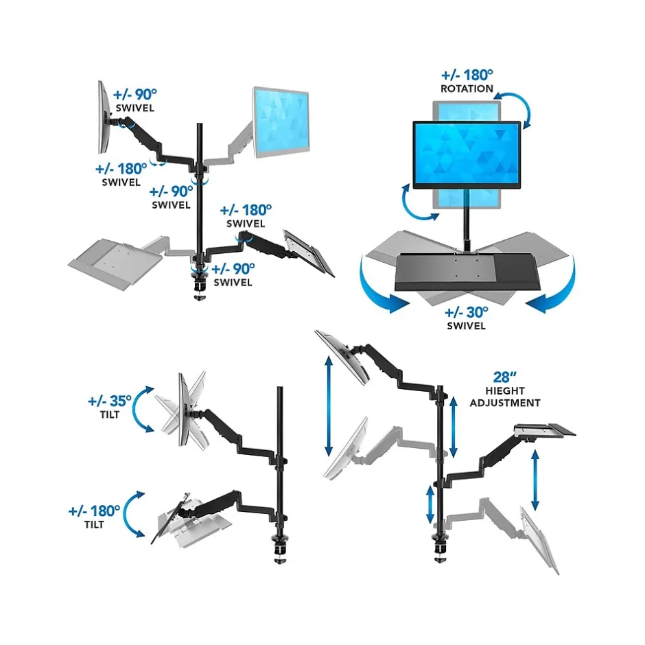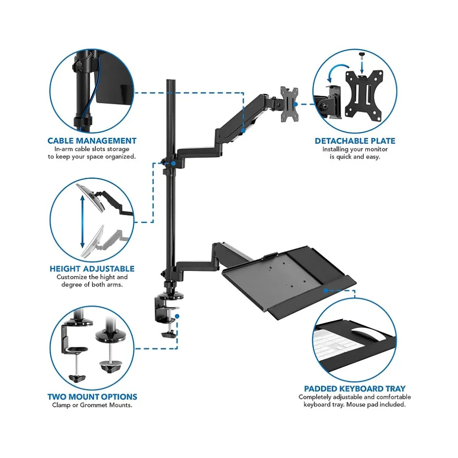 Mount your screen up to 32″ in size in either portrait or landscape orientation. The intuitive 25.7″ x 9.5″ keyboard tray underneath comes with a padded wrist rest to relieve additional stress on your wrists. Cable management system hides unwanted cables and wires from sight. The pneumatic counterbalance gas springs allow your monitor to tilt 35 degrees, swivel 180 degrees, and rotate 360 degrees so you can find the optimum viewing angles. Clamp or grommet onto your work desk.