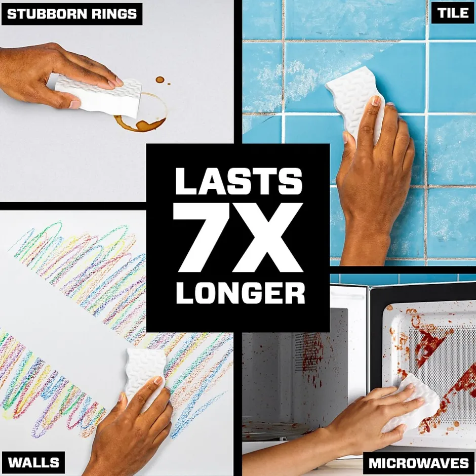 The Mr. Clean Magic Eraser Original pad erases marks on walls, floors, and more. To discover the cleaning possibilities, simply take a swipe. Micro-scrubbers reach into the surface grooves, lifting away built-up dirt and grime. The Mr. Clean Magic Eraser Original pad works with water alone.