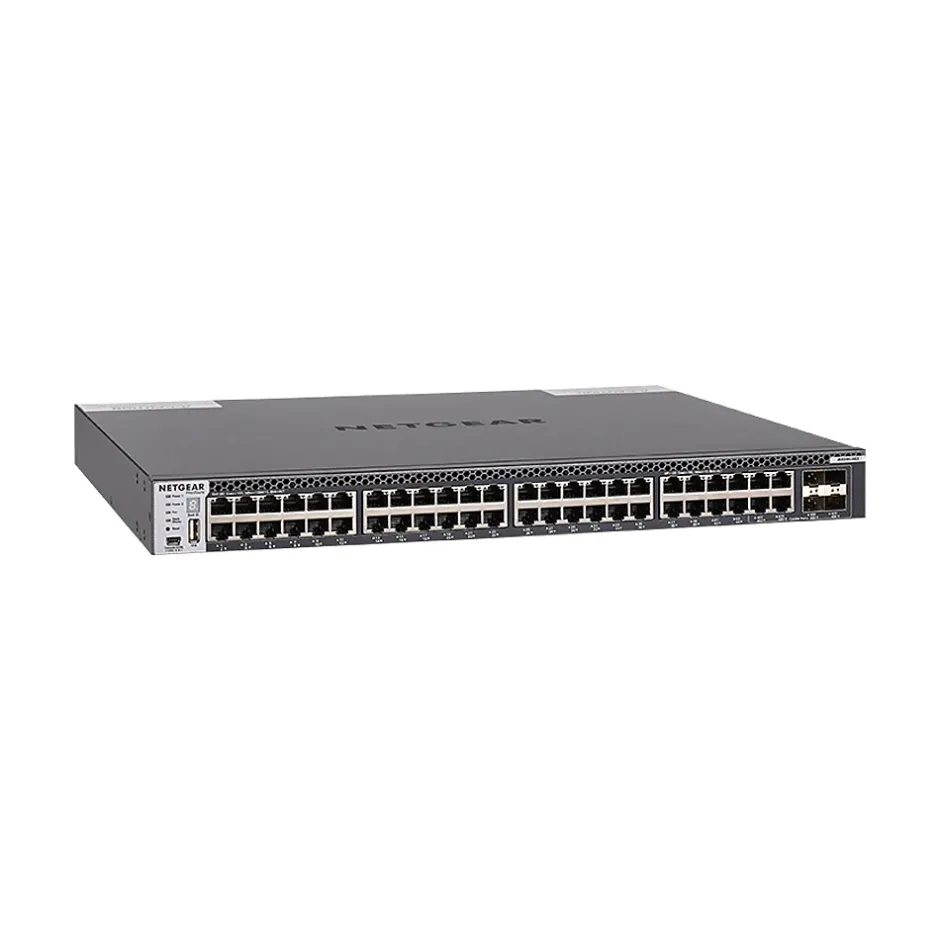 The Netgear M4300-48X switch delivers L2/L3/L4 and IPv4/IPv6 cost-effective services for mid-enterprise edge and SMB core deployments with unrivaled ease of use. Nonstop forwarding (NSF) virtual chassis architecture provide advanced High Availability (HA) with hitless failover across the stack. Intelligent Netgear IGMP Plus multicast allows for scalable Pro AV installations at Layer 2 without the PIM complexity. Dual redundant, modular power supplies equipping full width models contribute to business continuity management. Layer 3 feature set includes static, dynamic and policy-based routing – as standard. The Netgear M4300 Switch Series is perfect for wireless access, unified communications and professional AV-over-IP installations. Netgear Intelligent Edge Switch solutions combine latest advances in hardware and software engineering for higher flexibility, lower complexity and stronger investment protection, at a high-value price point.
