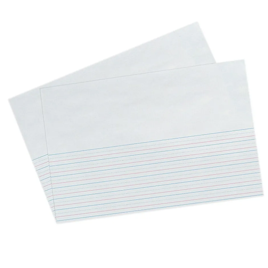Clean White newsprint printed both sides with 6″ blank space at the top of the sheet. Red baseline, dotted blue midline and Skip-A-Line format. Sheets measure 18″ x 12″. Each pack includes 250 sheets. Recyclable. Sold as 2 packs for a total of 500 sheets.