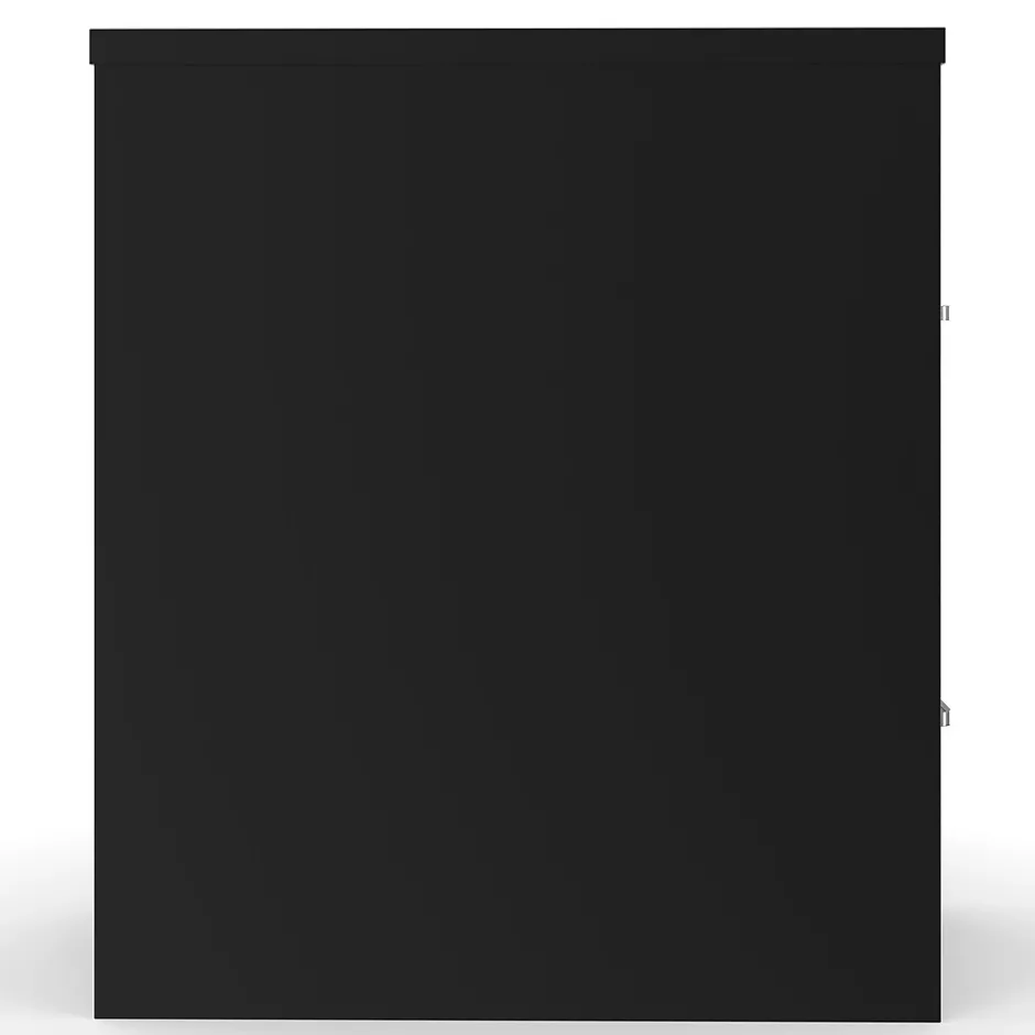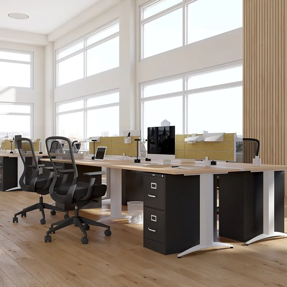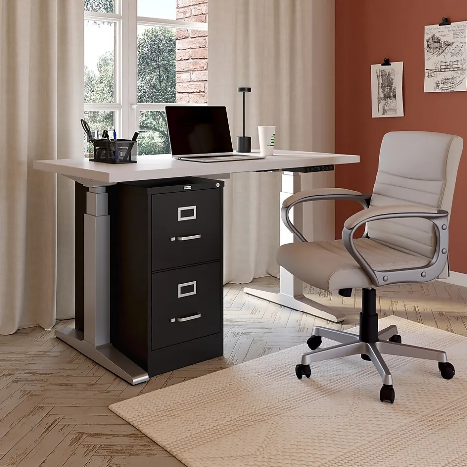 Conserve office space and store important documents, paperwork and records in this two-drawer vertical file cabinet. Ideal for workspaces of all sizes, this compact cabinet takes up minimal floor space and boasts a scratch-resistant black baked-enamel finish that enhances and blends with office decor. The two deep file drawers provide plenty of space for storing letter-size folders. This two-drawer vertical file cabinet keeps stored materials in place with adjustable wire followers.