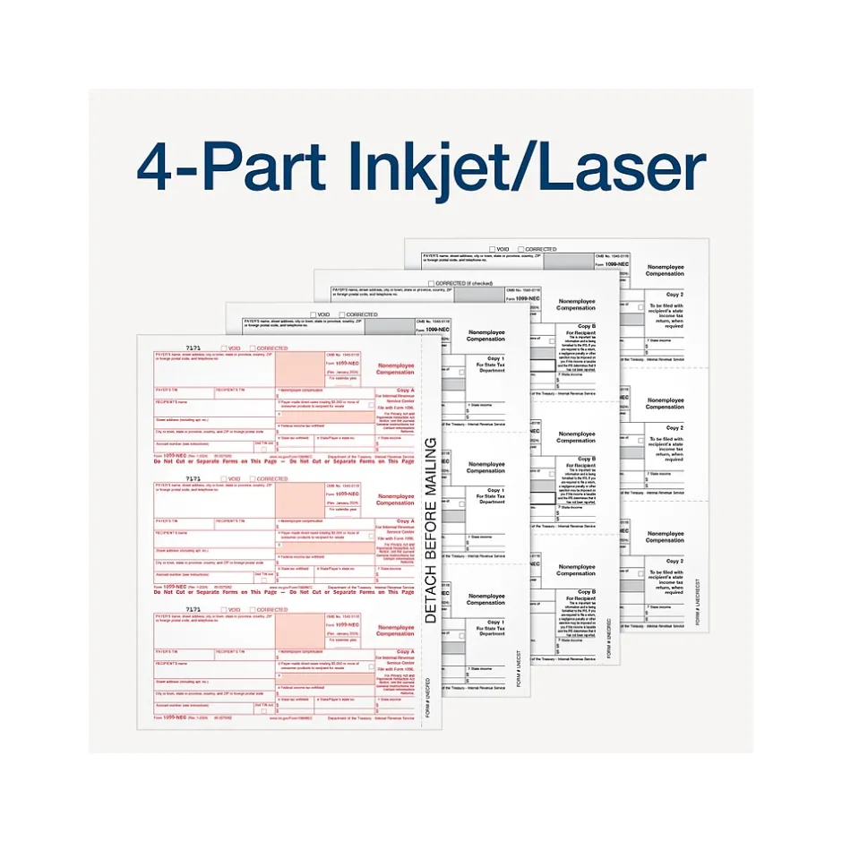 - 4-Part 1099-NEC forms print 3 to a page on 6 micro-perforated sheets with copies A, 1, B & 2