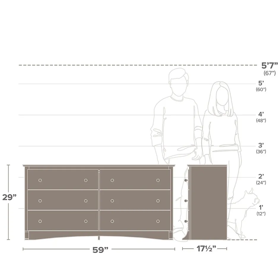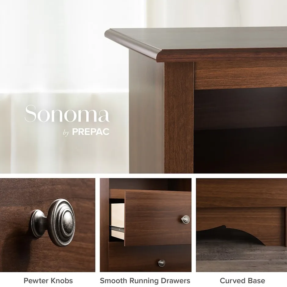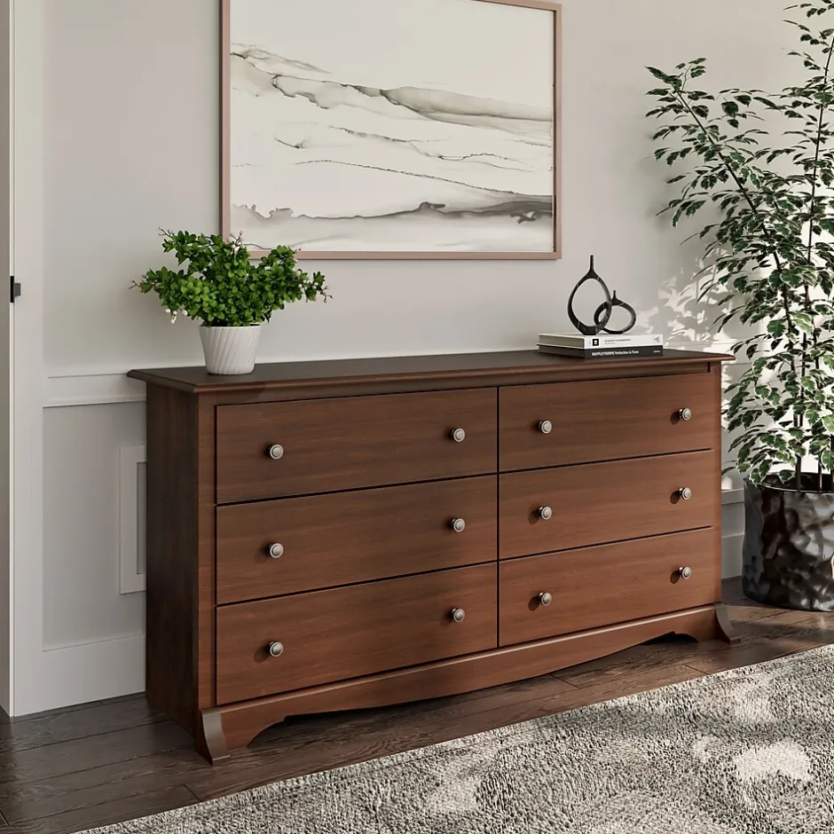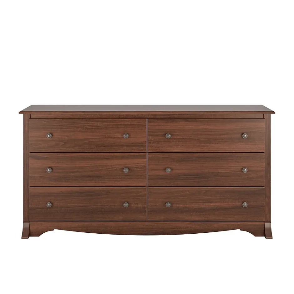 Prepac Monterey 6-drawer chest in cherry finish is constructed from CARB-compliant laminated composite woods which give an elegant look to any room. Drawer chest has a sturdy top to pile on your books, cell phone, alarm clock, lamp and more.