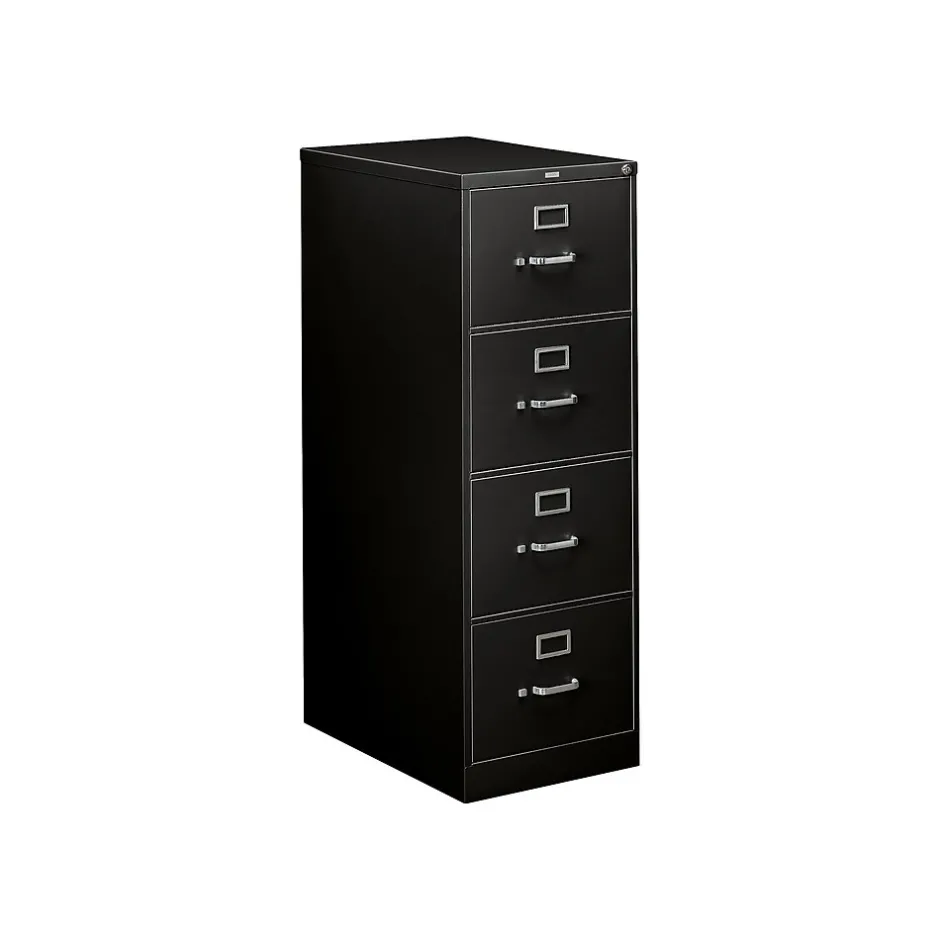 - Four-drawer vertical filing cabinet holds legal-size documents